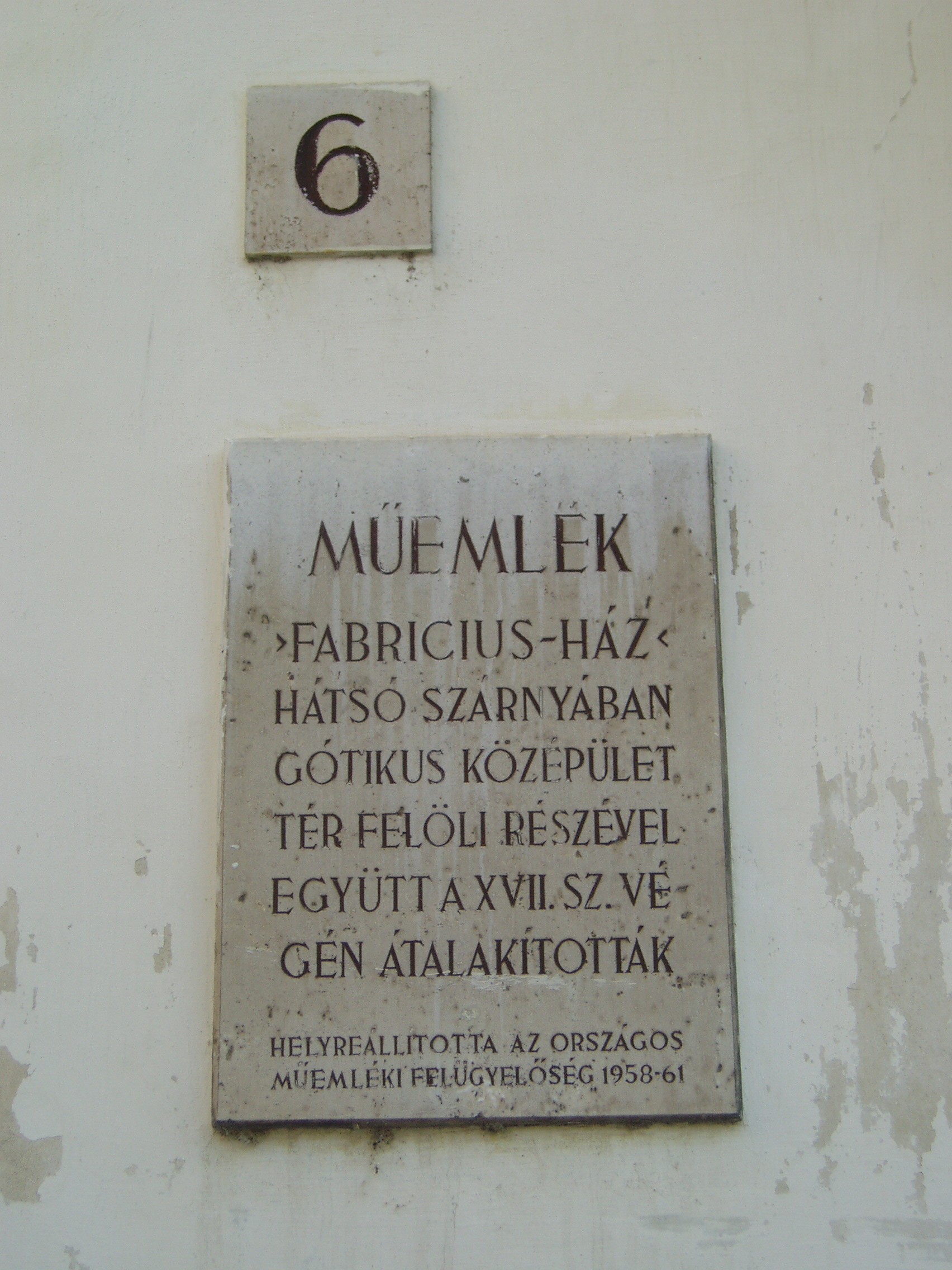 Nyilvános 1033 | 1434 | Fő tér 6. Fabricius-ház | A középkorban a telken két ház állt, amelyeket római kori középület maradványain emeltek. Folyamatos bővítések után a gótikus épületeket a XVIII. században kapcsolták össze, ekkor nyerte el a ház mai alakját. Ebből az időből származik az udvar kétemeletes loggiája és az utcai szárny emeletén a faragott famennyezet. Fő téri homlokzata a XIX. század elejéről származik. A ház hátsó fala a középkori városfalra épült, sőt, valószínűleg azonos is a városfallal. Az épületet 1806-ban vette meg a Felvidékről származó Fabricius András. Soproni katonáskodása idején gyakori látogatója volt a háznak Petőfi Sándor. A Fabricius család később az evangélikus egyháznak adományozta. A kép 2008 júniusában készült. Felh.irod.: Czellár Katalin: Sopron. 3. jav. kiad. Bp. Panoráma, 2000 |