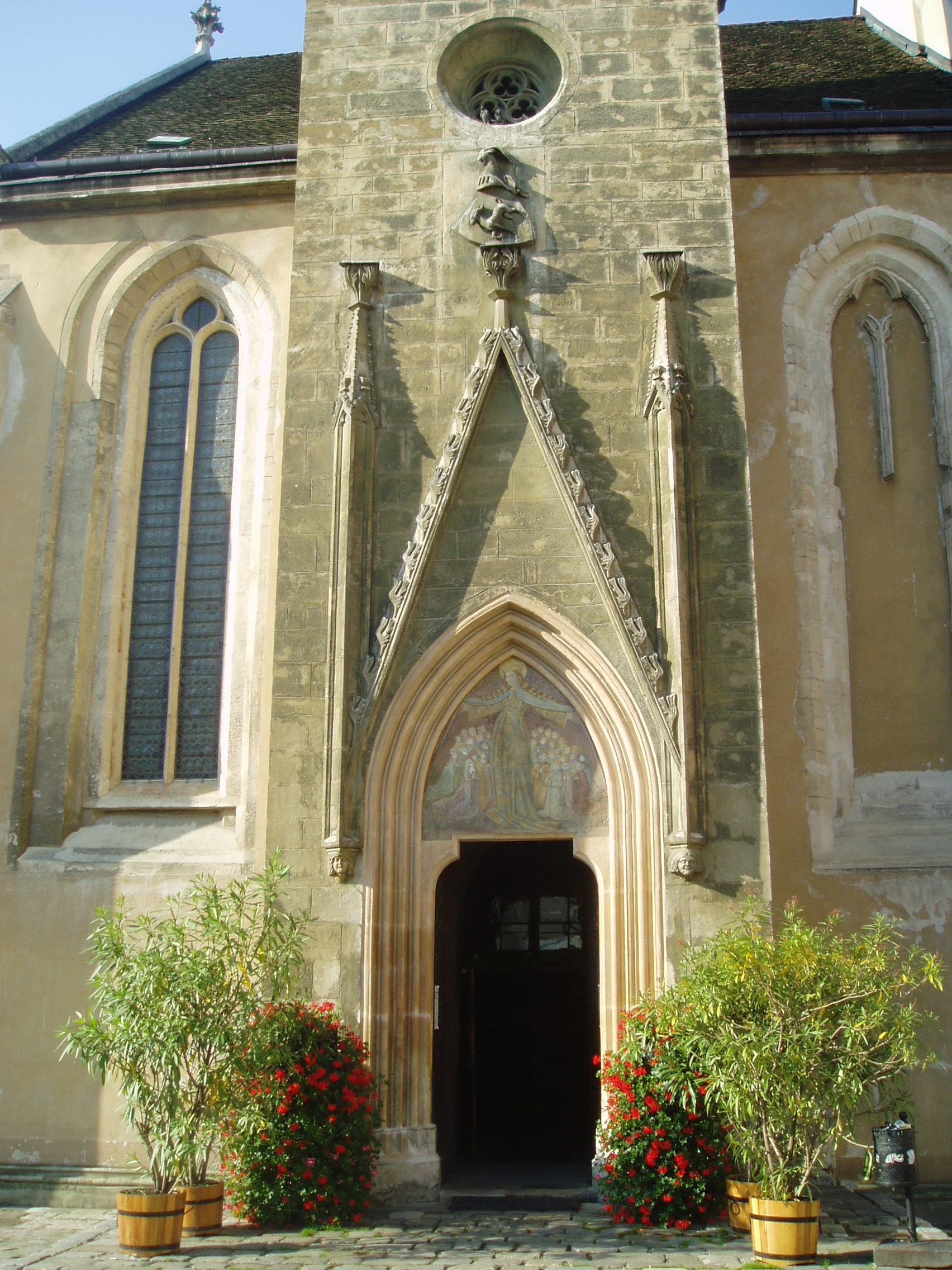 Nyilvános 922 | 1442 | Sopron, Fő tér: Kecske-templom | A soproni Fő tér ékességét, a gótikus Kecske–templomot és a hozzá tartozó ferences kolostort a XIII. század második felében kezdték építeni. Tornya a XIV. század első negyedében készült el; mai alakja id. Storno Ferenc 1888–1894 között végzett helyreállításának eredménye. Szokatlan nevét a kapuzat felett látható faragott állatfiguráról kapta (a ma látható kecske Storno Ferenc faragványa, az eredeti a Káptalanteremben van), amelyről kiderítették a kutatók, hogy az építtető Gaisel család címerállata volt. Maga a templom faragott kőből épült, háromhajós, északi oldalán toronnyal díszített kora gótikus épület, berendezése a későbbi századokból származó barokk, illetve rokokó stílusú. Déli hajójának közepén áll egy XV. századból származó, márványból készült szószék. Ebbe ágyazták bele azt a fából faragott szószéket, amelyről állítólag Kapisztrán János prédikált a templom előtt a török ellen. A templom többször volt színhelye országos jelentőségű ünnepségeknek, reprezentációs alkalmaknak: 1553 és 1681 között öt alkalommal falai között tartották az országgyűlési ünnepeket; 1625-ben királyt (III. Ferdinánd), 1622-ben és 1681-ben királynét koronáztak benne. 1787-ben feloszlatták a ferences rendet, s az épületegyüttest később a bencések kapták meg. A fénykép 2008 júniusában készült. Felh. irod.: Czellár Katalin: Sopron. 3. jav. kiad. Bp. Panoráma, 2000 Albert Tibor: Sopron–Vas vármegyei útikönyv. Magyar múlt — osztrák–magyar jelen. Kőszeg, Városkapu Kiadó, 2005 |
