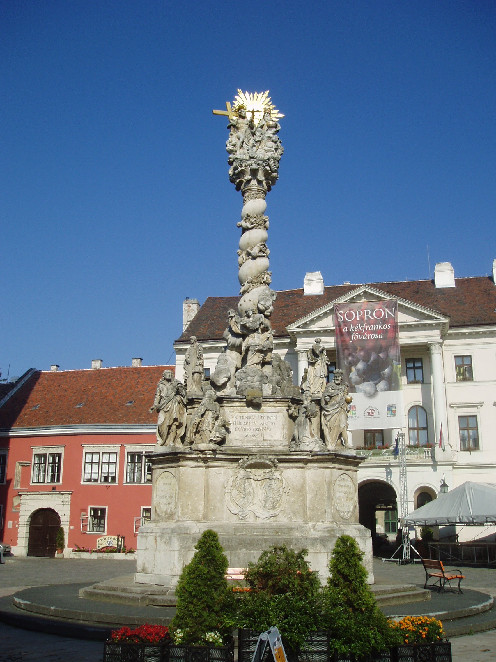 Nyilvános 786 | 1106 | Sopron, Fő tér: Szentháromság oszlop | A Fő téren áll a Szentháromság szobor, amely a magyarországi barokk szobrászat egyik legkiemelkedőbb alkotása. 1695 és 1701 között készült Thököly Katalin és harmadik férje, Löwenburg Jakab alapítványából. Az évszázadok során többször restaurálták. Talapzata három, egymásra állított, íves oldalú négyzetes hasábból áll. A másodikon az adományozó házaspár, valamint négy szent alakja helyezkedik el. Felhőcsomókon emelkedik a korinthoszi fejezetes csavart oszlop, amelyet virágfüzérek közt lebegő angyalkák díszítenek. Az oszlopfőt a Szentháromság csoportja koronázza. Az oszlop aljánál Immaculata-szobor és szentek alakjai állnak. A fénykép 2008 júniusában készült. Felh. irod.: Czellár Katalin: Sopron. 3. jav. kiad. Bp. Panoráma, 2000 |