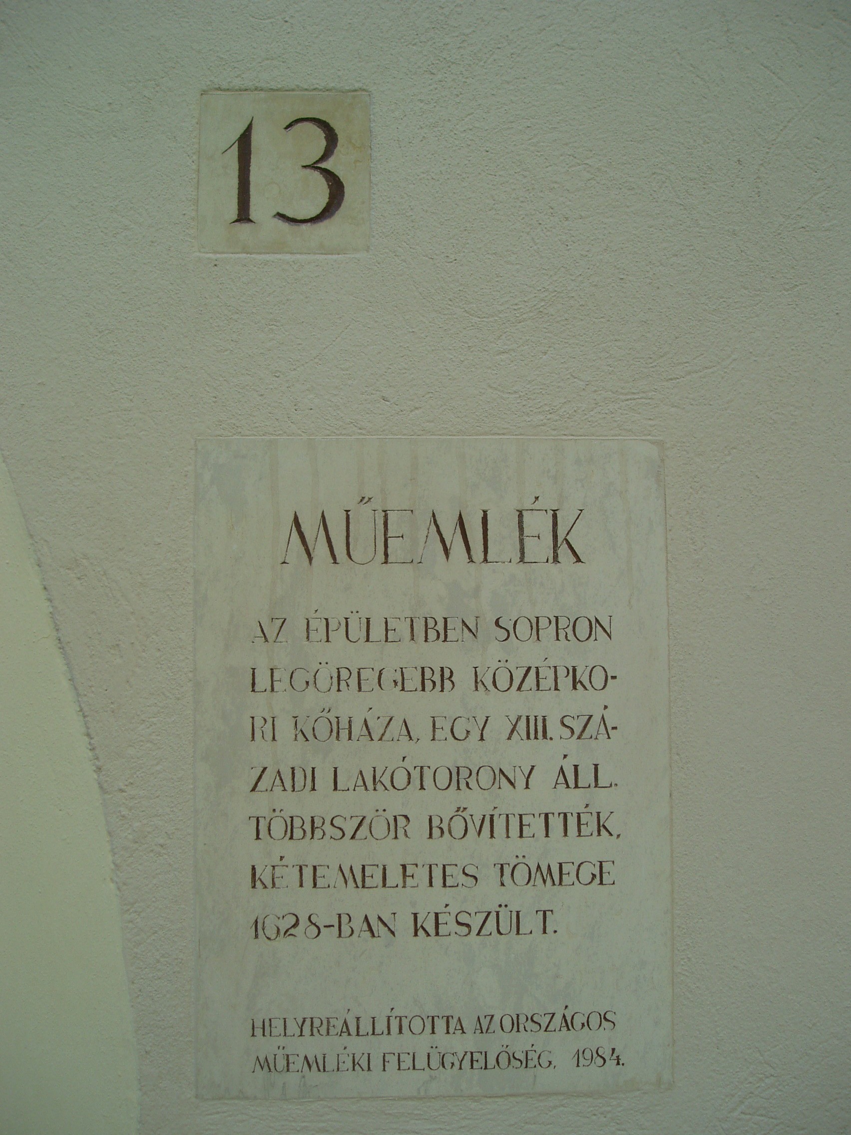 Nyilvános 931 | 1352 | Sopron, Kolostor utca 13. | A lakóház Sopron eddig ismert legkorábbi világi kőépületének fennmaradt részeit őrzi: egy XIII. századi lakótornyot. A középkorban a mai Kolostor utca 13. és az Új utca 16. egy telek volt, s amikor a lakótornyos beépítést a harántházas váltotta fel, jómódú tulajdonosa a telek végében reprezentatív termet készíttetett. Ennek három szép gótikus ablakát az Új utca 16. számú épületen láthatjuk. 1628-ban az épületet kibővítették, majd kétemeletes formában épült újjá. Homlokzata egyszerű, követi az utca vonalát. A lakótoronyból megmaradt az alsó szint, a későromán keresztboltozat maradványa s egy alacsony emeleti ajtó. A mai épület kis udvarán festői szabad lépcső visz az emeletre, ahol egy toszkán oszlopos, pilléres, keresztboltozatú loggia van, fölötte zárt erkéllyel. A fénykép 2008 júniusában készült. Felh. irod.: Czellár Katalin: Sopron. 3. jav. kiad. Bp. Panoráma, 2000 |