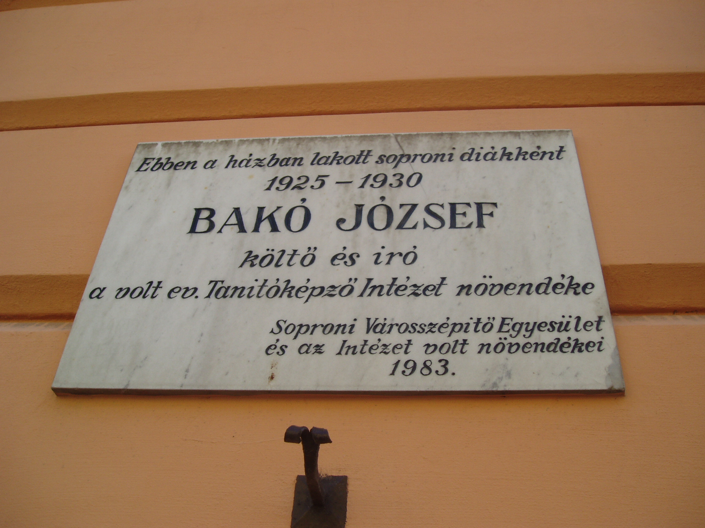Nyilvános 971 | 1546 | Sopron, Móricz Zsigmond utca 8. | Az emeletes épületen 1983-ban elhelyezett emléktábla tanúsága szerint soproni diákként ebben a házban lakott 1925 és 1930 között Bakó József költő és író, a volt evangélikus tanítóképző intézet növendéke. Bakó József (Nemescsó, 1896. aug. 24. - Bp., 1962. ápr. 7.): költő, elbeszélő. Zsellércsaládból származott, Másfél évtizedig cipész volt. A Tanácsköztársaság bukása után hét hónapi fogházbüntetést kapott. Utána sokat hányódott, amíg elvégezte a tanítóképzőt. Több helyen tanított, nyaranta bebarangolta egész Európát. A felszabadulás után dolgozott a vallás- és közoktatásügyi minisztériumban, a Köznevelés szerkesztőségében, valamint több könyvtárban, legutóbb az Országgyűlési Könyvtárban. Írásai már az 1920-as évek elejétől megjelentek a Népszavában, a Nyugatban, a Pesti Naplóban. Verseiben a paraszti élet nyomorát szólaltatta meg erőteljes realizmussal, hangja később forradalmibb, a felszabadulás után a megváltozott életről rajzolt képet. Prózai műveiben is a falusi élettel foglalkozott. A fénykép 2008 júniusában készült. Felh. irod.: http://www.netlexikon.hu/yrk/Ryrgenwm/613 |