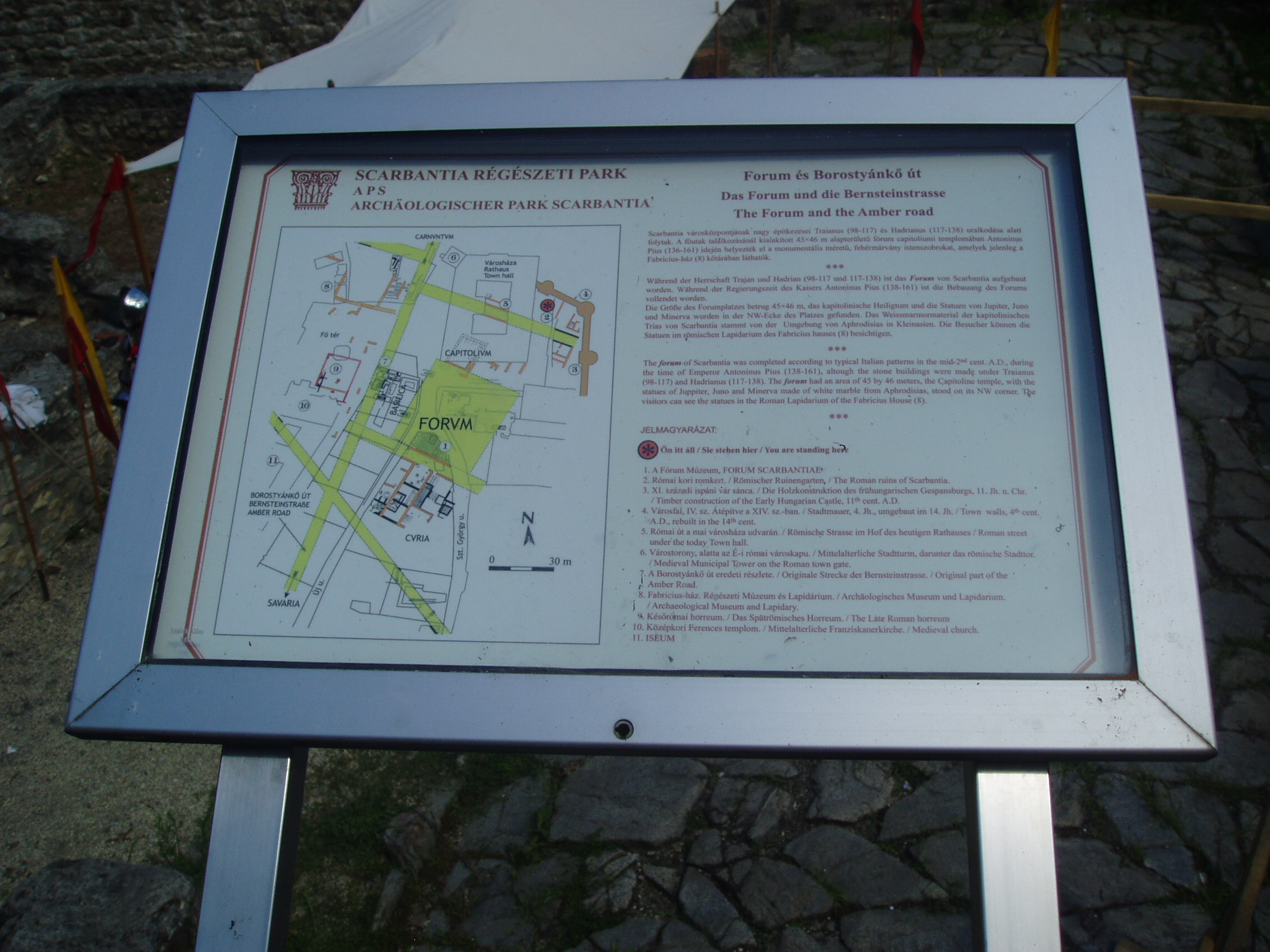 Nyilvános 896 | 1292 | Sopron, Scarbantia Régészeti Park | Az egykori Római Birodalom Pannónia provinciájának egyik határállomása Scarbantia, a mai Sopron volt. A római oppidum központjának, a fórumnak legfontosabb épületét - a capitoliumi templomot - 1893 telén a városháza építésekor találták meg. Az 1960- és 1970-es évek ásatásaival végül sikerült meghatározni a fórum teljes kiterjedését és elhelyezkedését. A mai belváros szívében feltárt maradványokat - kiegészítve a a XI. századi ispáni vár feltárt sáncával - nagyszabású szabadtéri régészeti kiállítás keretében, térképekkel, ismertetőszövegekkel kellően ellátva szemlélheti meg a városnéző. A kép 2008 júniusában készült. |