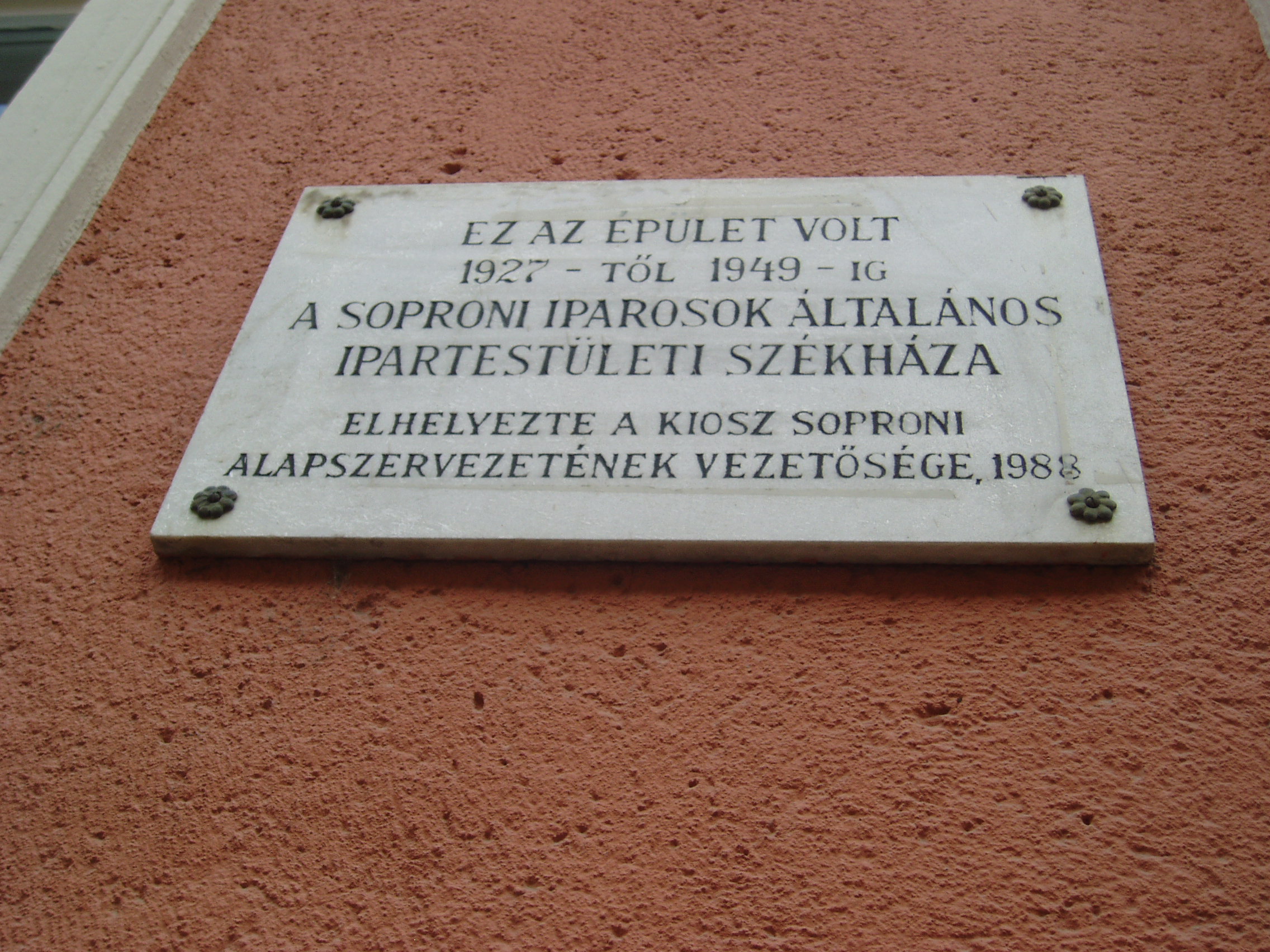 Nyilvános 918 | 1253 | Sopron, Szent György utca 20. | Ezen a helyen már az Árpád korban lakóház állt, maradványait az épület pincéje rejti, rajtuk két középkori kút található. 1927 és 1949 között ez volt a soproni iparosok Általános Ipartestületének székháza, emeletén a hétablakos nagyteremmel. A kép 2008 júniusában készült. Felh. irod.: Czellár Katalin: Sopron. 3. jav. kiad. Bp. Panoráma, 2000 |