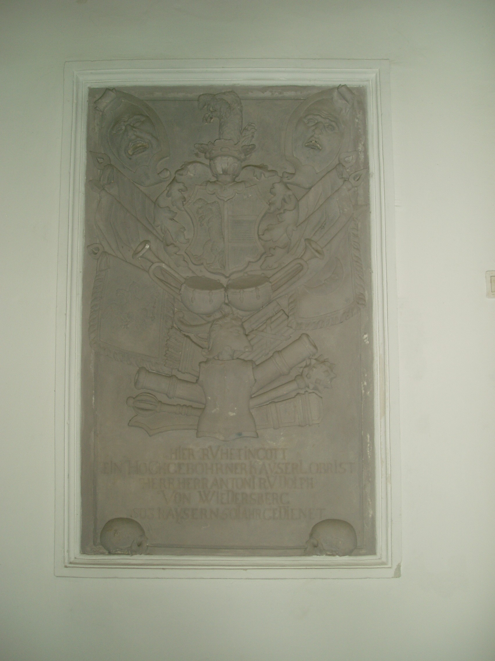 Nyilvános 975 | 1466 | Sopron, Szent György utca 7. Szent György-templom | A Káptalan-házhoz azonos házszámmal csatlakozik a Szent György-templom. Az 1380–1430 között épült, eredetileg gótikus templom mozgalmas, olaszos homlokzata a XVII. századból származik, de rajta két gótikus dombormű máig megőrződött. Kisebb mértékben az 1760-as években is átalakították. Eklektikus tornya 1882-ben épült. Az egyhajós templomot az 1676-os tűzvész után több lépésben alakították át: a csúcsíves lezárású főhajót gazdag stukkóval díszítették, és két oldalán kápolnasorral keretezték. A szentély melletti keresztelőkápolnában középkori freskótöredéket látni. Az 1705–1706 között készült stukkódísz Pietro Antonio Conti műve, és berendezése is XVIII. századi. A képen egy bizonyos Anton Rudolph von Wiedersberg címerrel és hadijelvényekkel díszített sírköve látható (1737), az Utolsó Ítélet-kápolnában. A kép 2008 júniusában készült. Felh. irod.: Czellár Katalin: Sopron. 3. jav. kiad. Bp. Panoráma, 2000 http://www.domsopron.hu |