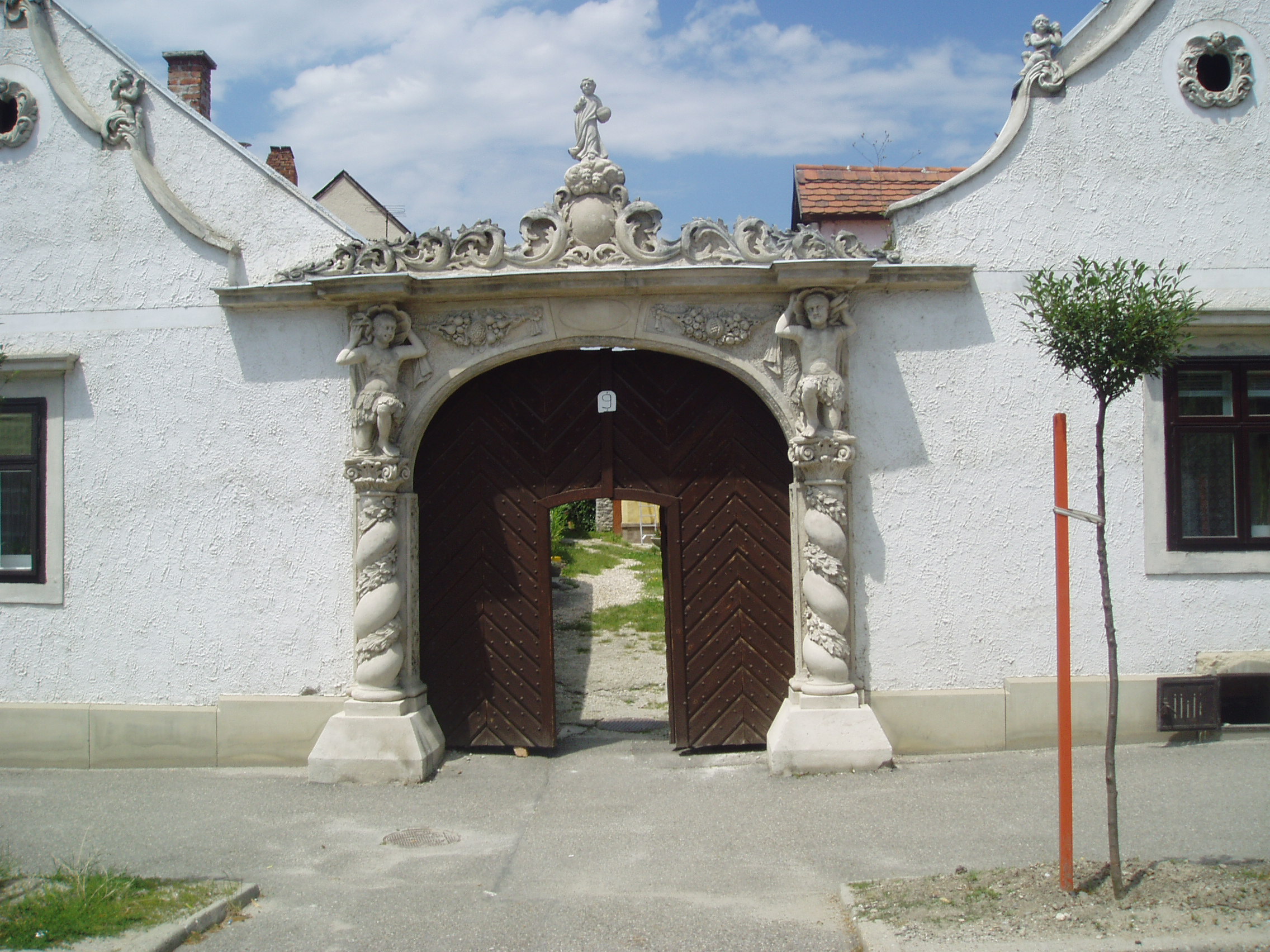 Nyilvános 980 | 1455 | Sopron, Szent Mihály utca 9. Két mór-ház | Az épület két XVII. századi, oromzatos parasztházból alakult ki az 1700-as évek elején. Ekkor Leitner Szervác szobrász volt a tulajdonosa, aki népies barokk stílusban gazdagon díszítette a homlokzatot. A két házat mozgalmas díszítésű kapu köti össze, melyet két korinthoszi csavart oszlop keretez, a tetején egy-egy mór alakjával. Az oromzatok közepén dús keretezésű fülkében Mária, illetve Szent József szobra áll.A fülkék mellett két kis kerek ablak van, gazdag keretezéssel. Az oromzatok hullámos széleit angyalkák díszítik, csúcsukon Szent Flórián és Szent Rókus feje látható. A kép 2008 júniusában készült. Felh. irod.: Czellár Katalin: Sopron. 3. jav. kiad. Bp. Panoráma, 2000 |