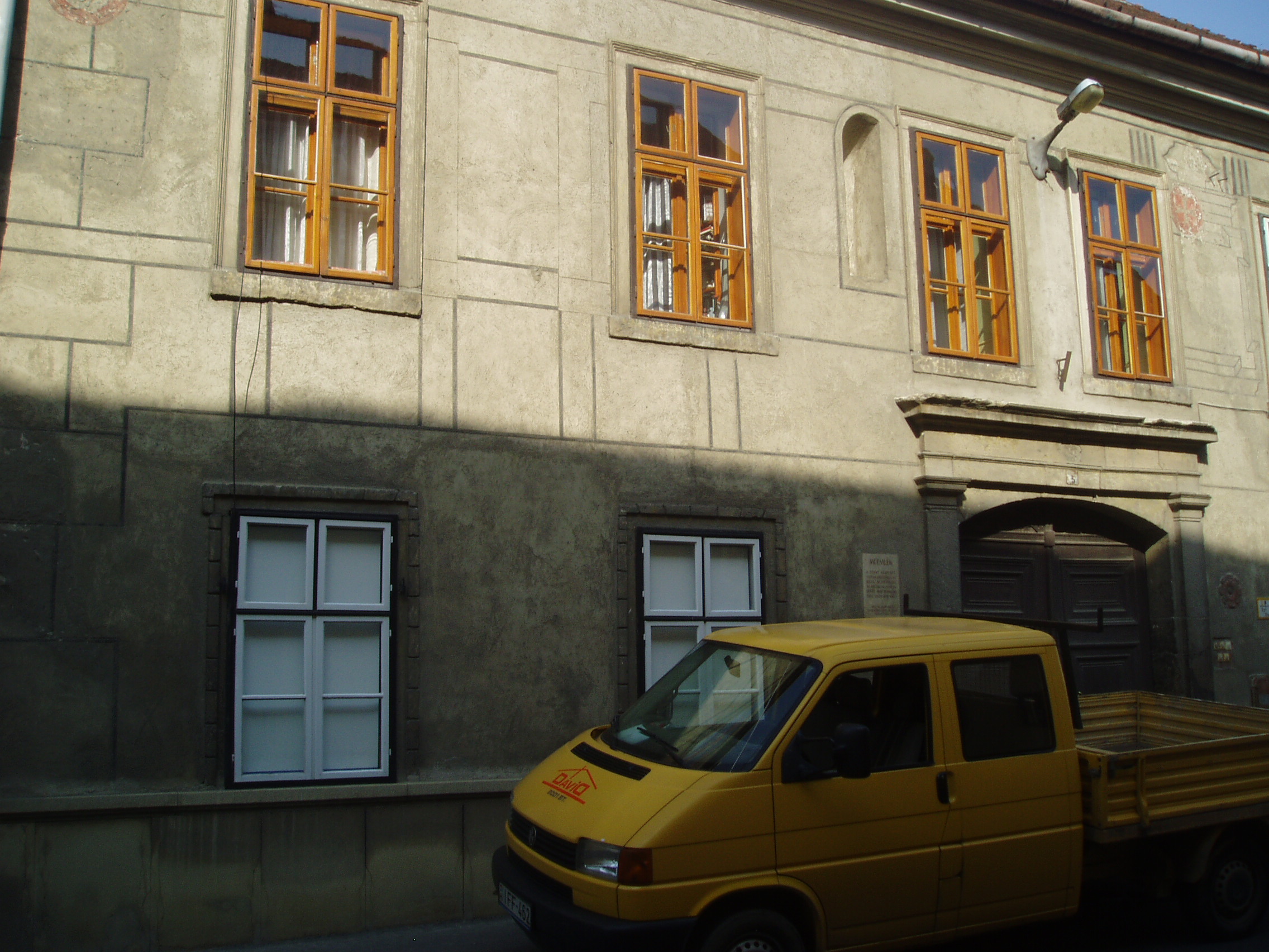 Nyilvános 941 | 1282 | Sopron, Szentlélek utca 5. | Az egykori Szent Kereszt oltárjavadalmas ház 1660 körül épült. Mai késő klasszicista homlokzata 1838-ból származik. A kép 2008 júniusában készült. Felh. irod.: Czellár Katalin: Sopron. 3. jav. kiad. Bp. Panoráma, 2000 |