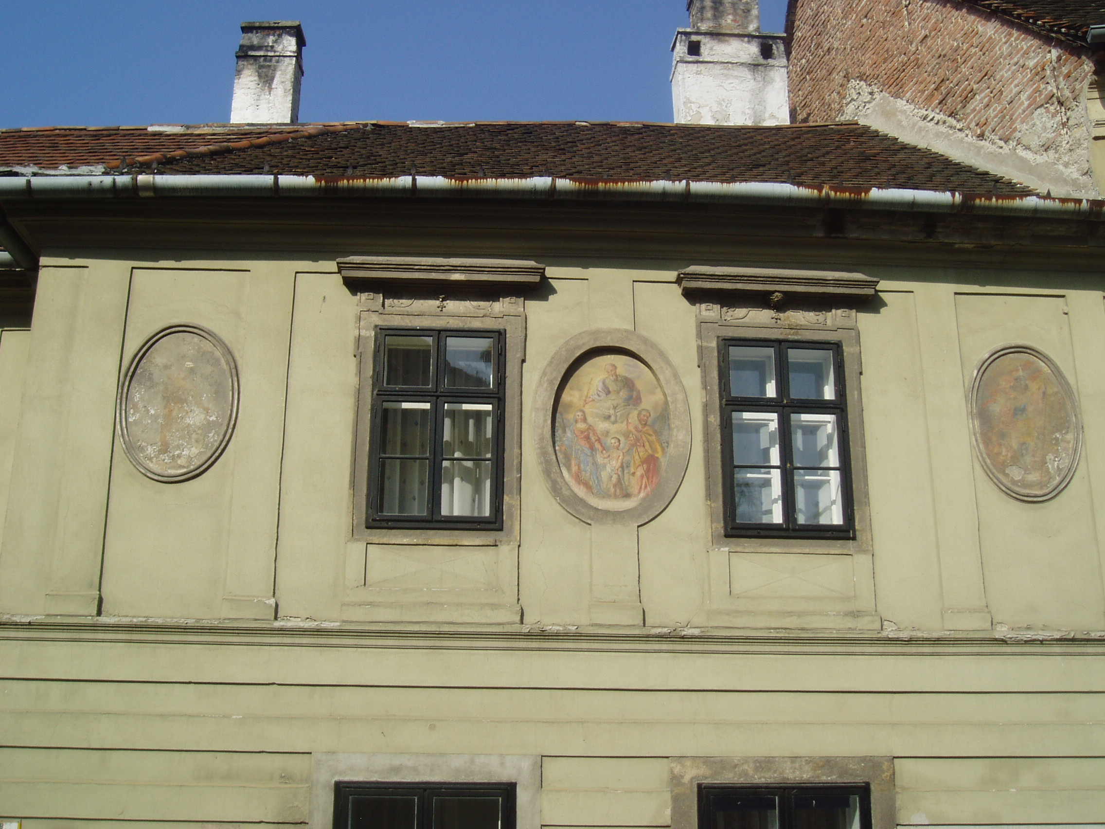 Nyilvános 918 | 1323 | Sopron, Szentlélek utca 7. | A középkori eredetű barokk lakóház mai alakját 1746-ban nyerte. Restaurálásakor megtalálták a rizalitjának emeletén levő freskókat, amelyek ma a homlokzat legfőbb ékességei: középen sima kőkeretezésben a Szent Család látható, balra ovális keretben Mária a gyermek Jézussal, jobbra - hasonló keretben - Szent Flórián. A kép 2008 júniusában készült. Felh. irod.: Czellár Katalin: Sopron. 3. jav. kiad. Bp. Panoráma, 2000 |