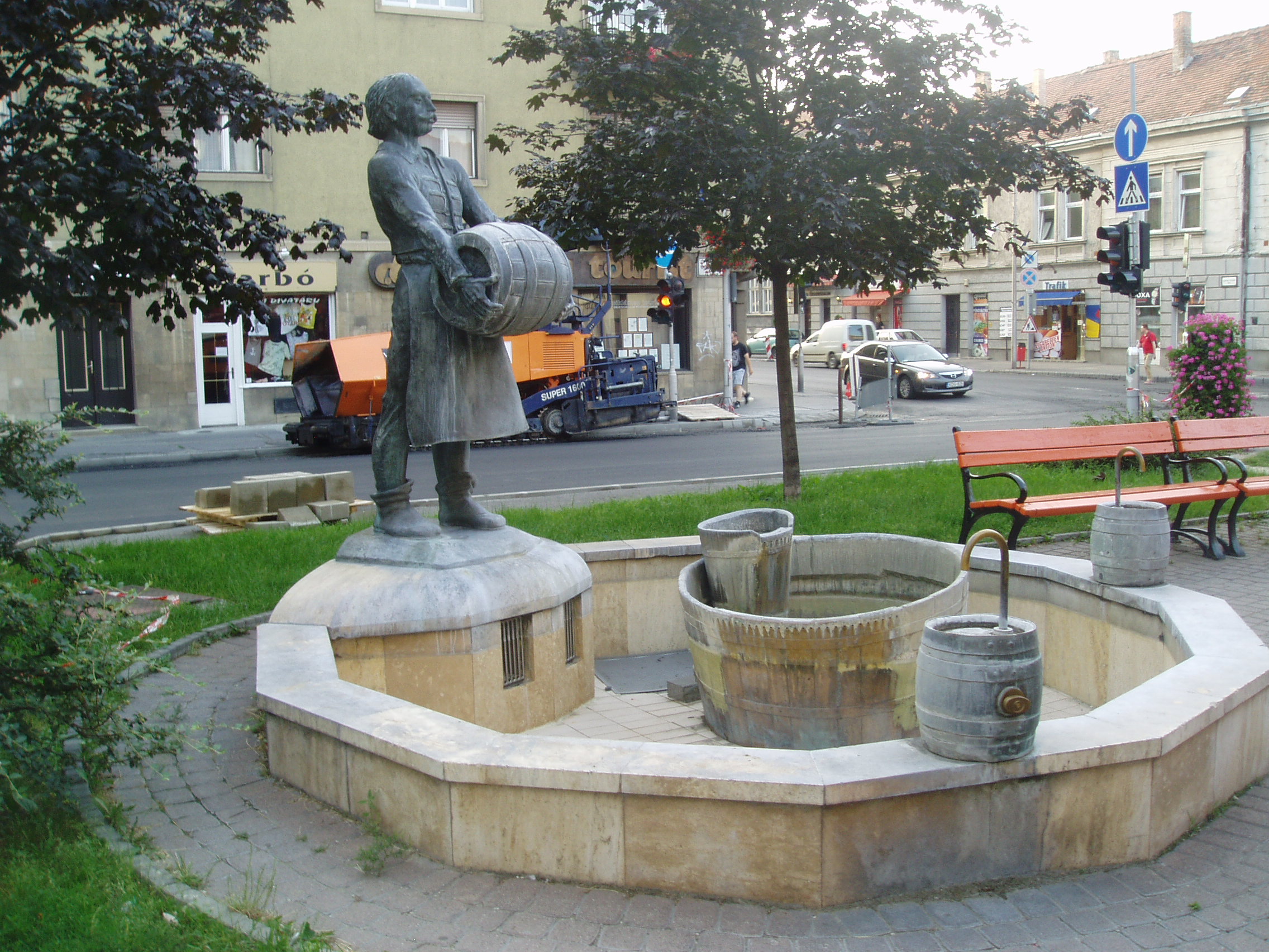 Nyilvános 953 | 1410 | Sopron, Színház utca 10. előtt: Sörmester-kút | A Színház utca és az Ógabona tér között 1995-ben állították fel Kapmfl József: Sörmester című, hamar népszerűvé vált szoborkompozícióját, amely ivókútként is szolgál. A kép 2008 júniusában készült. Felh. irod.: www.szoborlap.hu |