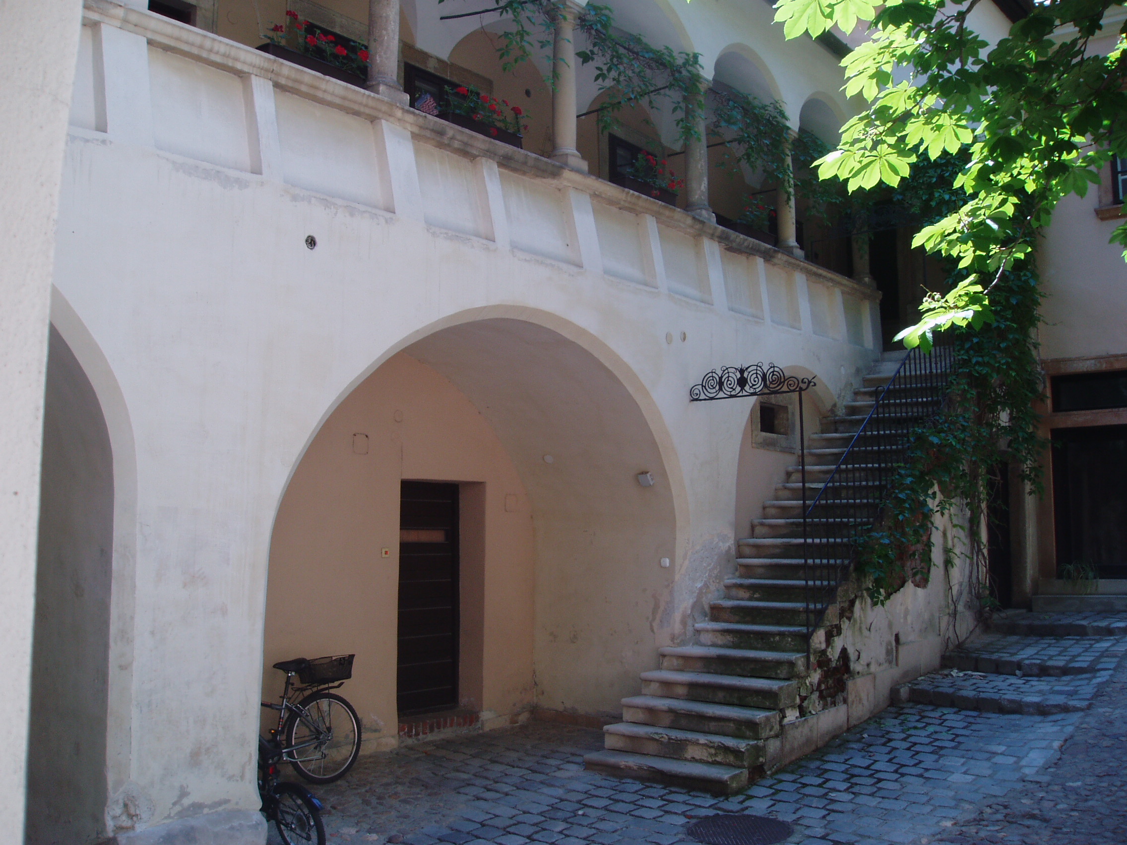 Nyilvános 939 | 1529 | Sopron, Templom utca 12. | Az eredetileg egyemeletes középkori lakóházra a XVII. századi késő reneszánsz, kora barokk átépítése során került a bejárati kapu felett félkörívesen kidomborodó zárt erkély, és ebből az időből kelteződik az udvari front kialakítása is. 1770 körül építették rá a második emeletet, amikor a Lassberg grófi család birtokába került. Az első emeleti nagyteremben ekkor városszerte híres bálokat rendeztek. 1866-ban vette meg az evangélikus konvent az épületet paplak céljaira, és azóta is az evangélikus egyház tulajdona. Dongaboltozatos, hosszú kapubejárójában a két oldalt kőráccsal díszített gótikus ülőfülkesor 1400 körül készült. A középkori eredetű épület 1866-ban került az evangélikus egyház tulajdonába, előbb paplakként hasznosították, majd ez lett Evangélikus Országos Múzeum soproni kiállítóhelye. A kép 2008 júniusában készült. Felh. irod.: Czellár Katalin: Sopron. 3. jav. kiad. Bp. Panoráma, 2000 |
