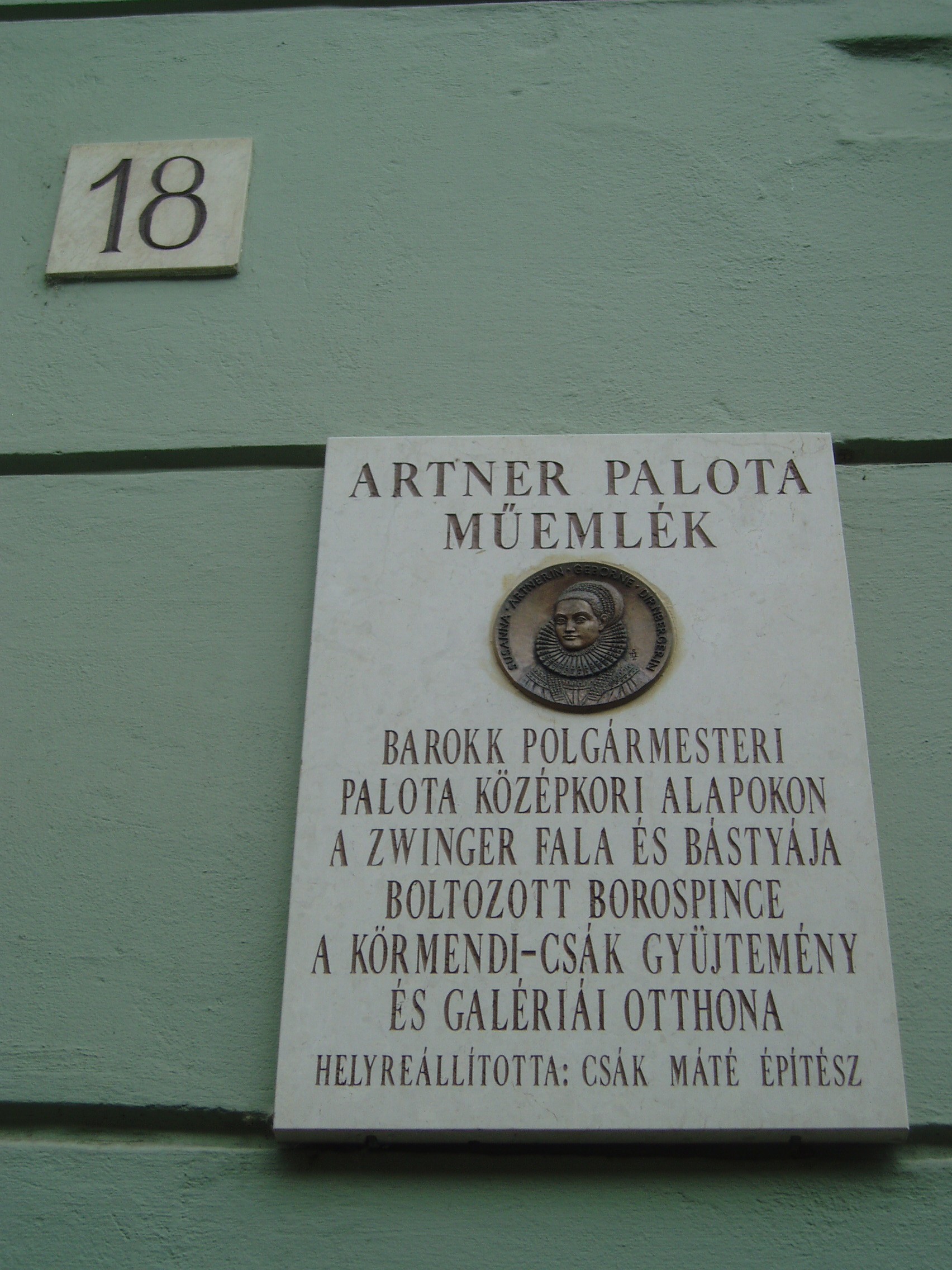Nyilvános 922 | 1275 | Sopron, Templom utca 18. Artner-palota | Az egyemeletes barokk lakóház első ismert tulajdonosa Artner Vilmos volt. A kapu fölötti címeren az ő neve és az 1723-as évszám olvasható. A kép 2008 júniusában készült. Felh. irod.: Czellár Katalin: Sopron. 3. jav. kiad. Bp. Panoráma, 2000 |