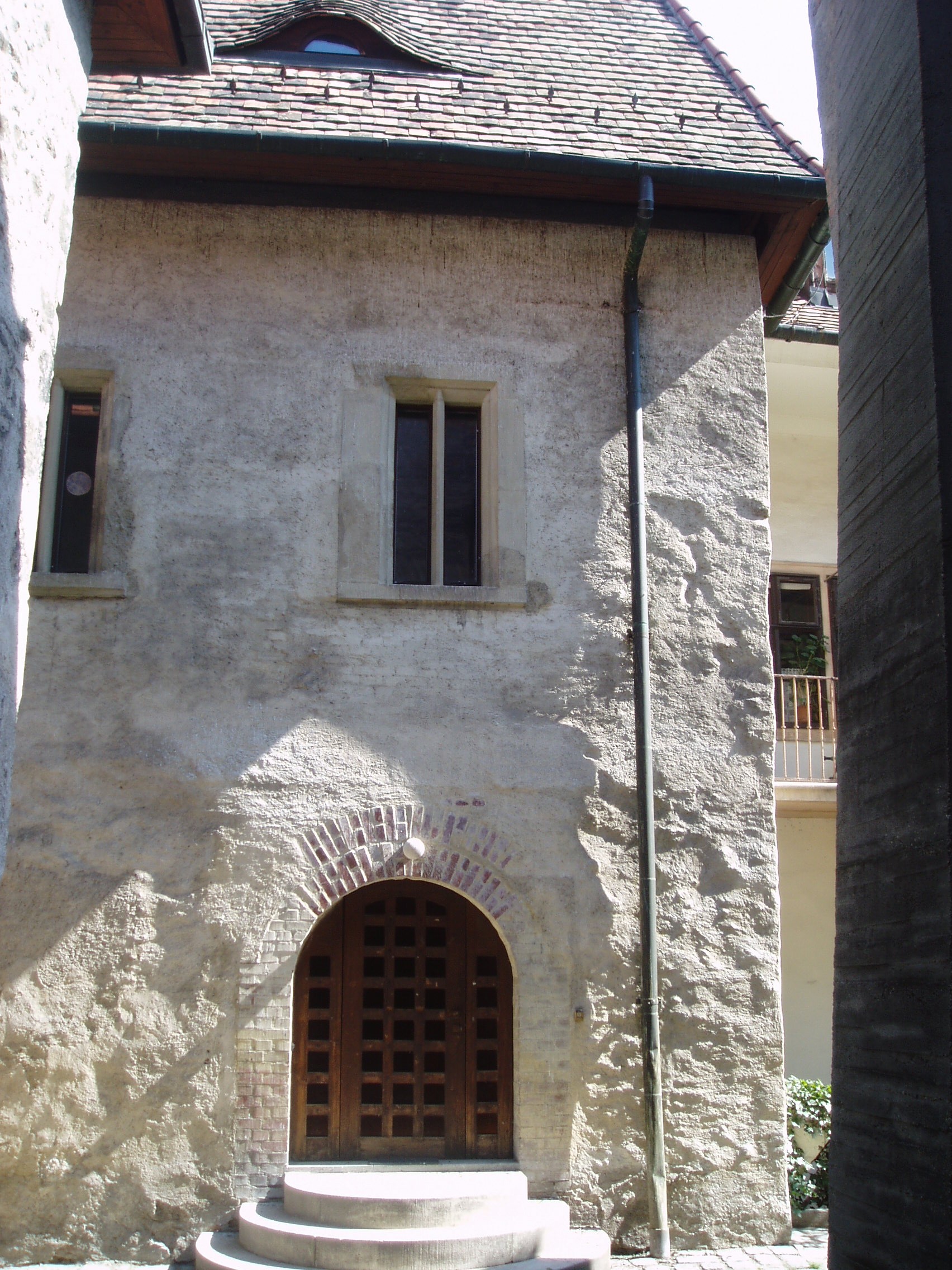 Nyilvános 945 | 1251 | Sopron, Új utca 11. | A középkori eredetű lakóház középkori zsinagógát rejt. Az első zsidók a XIII. században települtek be Sopronba. 1370 körül épült ez az imaházuk, egy Izrael nevű bankár magánzsinagógájaként. A többször átalakított épület egyszerű barokk homlokzatának bal oldalán nyílik a kosáríves kapuzat, amelyen át beléphetünk a középkori templomba: elsőként egy utcára nyíló, boltozatos terembe, majd innét magába a zsinagógába. A képen a boltozatos terem bejárata látható. A kép 2008 júniusában készült. Felh. irod.: Czellár Katalin: Sopron. 3. jav. kiad. Bp. Panoráma, 2000 |