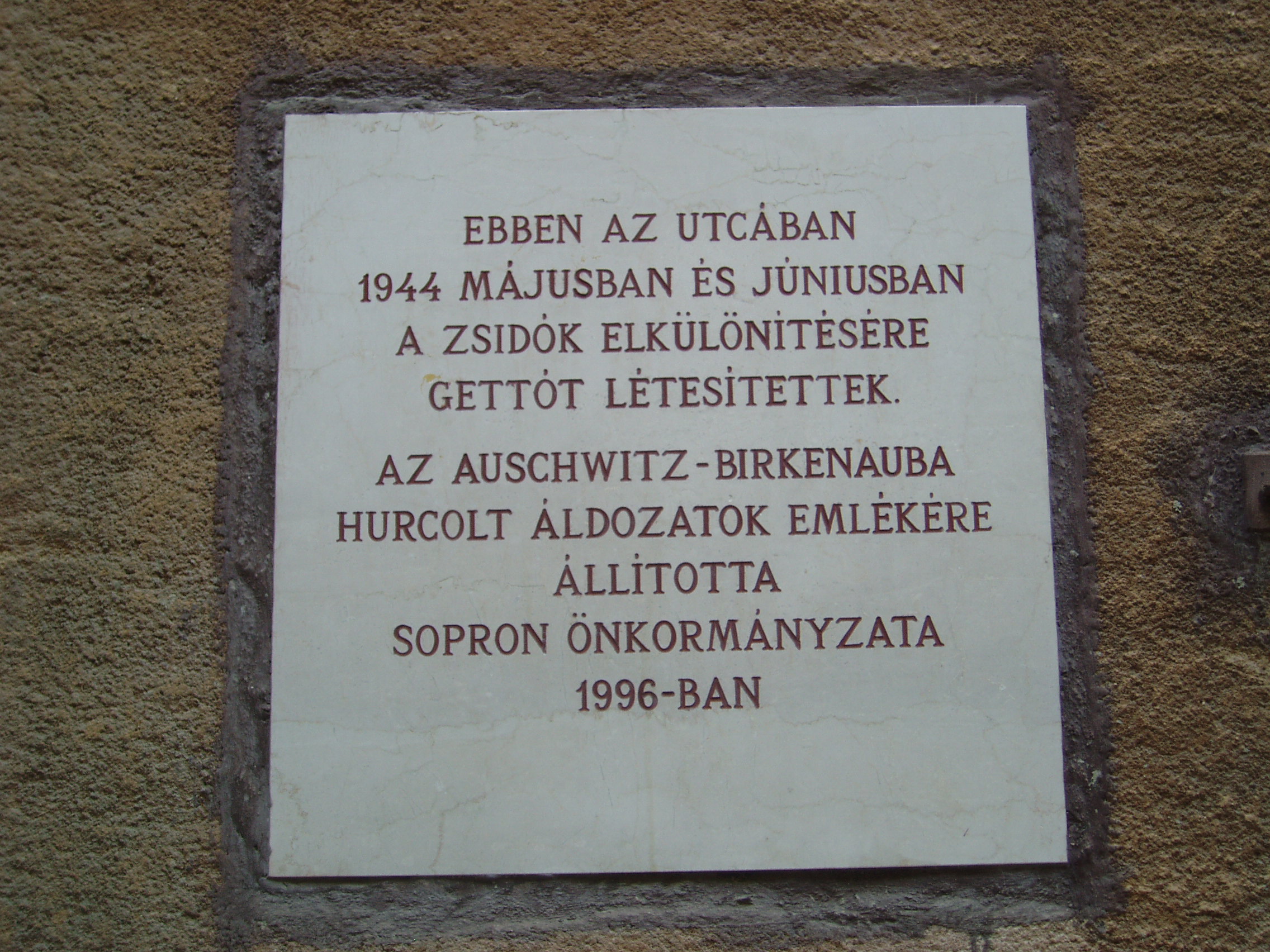 Nyilvános 945 | 1333 | Sopron, Új utca 28. | Az Új utca vonala a XIII. században alakult ki, s a várost ekkor kettéosztó fal az utcát is két részre tagolta. Az északi szakaszon lakótornyos házak emelkedtek, a déli szakasz a zsidók zsákutcája volt s Judengassénak (Zsidó utca) nevezték. Az Új utca nevet 1440 körül kapta, valószínűleg akkor, amikor áttörték a városfalat és egyesítették az utcát. 1944-ben ebben az utcában alakították ki a gettót, ahonnét Auschwitz-Birkenauba hurcolták a foglyokat. Emléktáblájukat az Új utca 28. számú épületen helyezték el. A kép 2008 júniusában készült. Felh. irod.: Czellár Katalin: Sopron. 3. jav. kiad. Bp. Panoráma, 2000 |