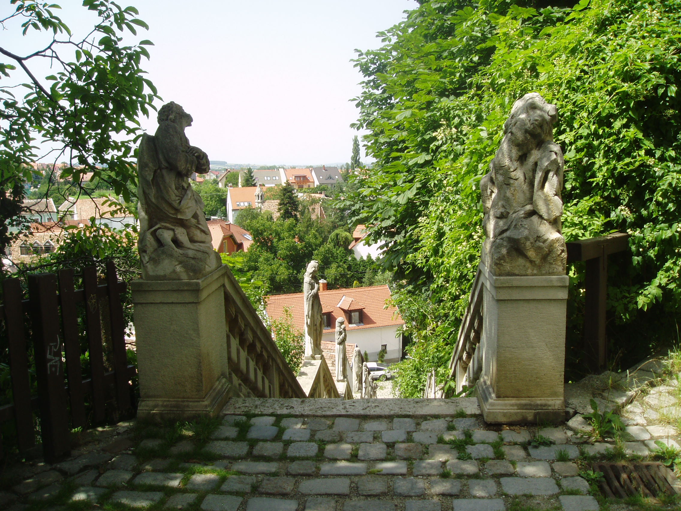 Nyilvános 1008 | 1483 | Sopronbánfalva: Kolostorhegy út: Karmelita templom és kolostor | Sopronbánfalva fölött a Sopronból Brennbergbányára vezető út déli oldán magas domb emelkedik. A dombot uraló gótikus eredetű, első formájában a XV. század végén épült templom és a hozzá csatlakozó barokk kolostorszárnyak eredetileg pálos szerzetesek, majd karmelita apácák otthona volt. Az épületegyüttest a település központjával a meredek domboldalban egyenesen húzódó díszes lépcső köti össze, amelyet karmelita-, vagy pálos lépcsőként ismer a köztudat. A lépcső hét lépcsőkarból és hét pihenőből áll. A pihenőkön, a baluszteres mellvéden jobbról-balról egy-egy szent kőszobra áll. A kép 2008 júniusában készült. Felh. irod.: Czellár Katalin: Sopron. 3. jav. kiad. Bp. Panoráma, 2000 |