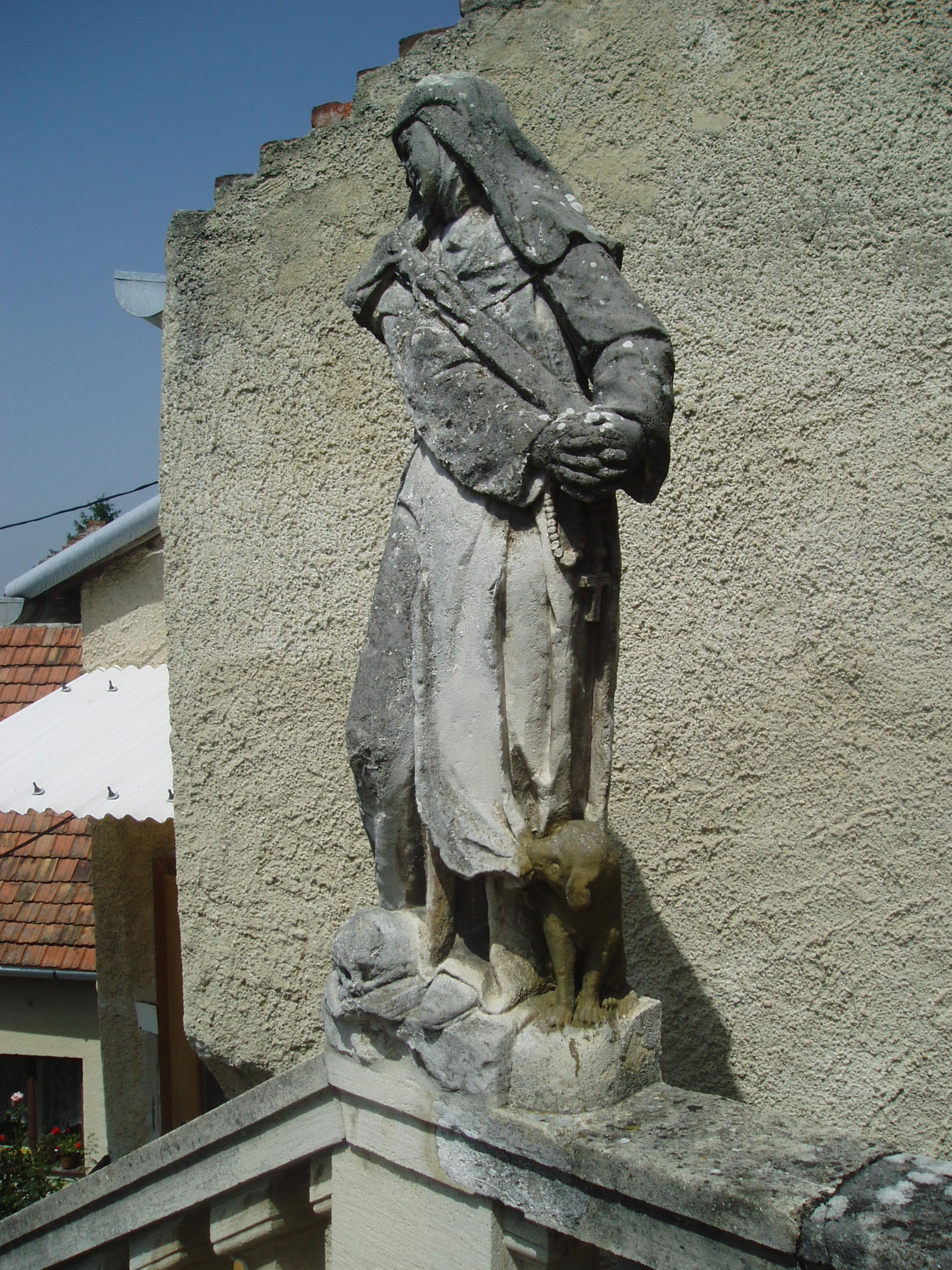 Nyilvános 1036 | 1774 | Sopronbánfalva: Kolostorhegy út: Karmelita templom és kolostor | Sopronbánfalva fölött a Sopronból Brennbergbányára vezető út déli oldán magas domb emelkedik. A dombot uraló gótikus eredetű, első formájában a XV. század végén épült templom és a hozzá csatlakozó barokk kolostorszárnyak eredetileg pálos szerzetesek, majd karmelita apácák otthona volt. Az épületegyüttest a település központjával a meredek domboldalban egyenesen húzódó díszes lépcső köti össze, amelyet karmelita-, vagy pálos lépcsőként ismer a köztudat. A lépcső hét lépcsőkarból és hét pihenőből áll. A pihenőkön, a baluszteres mellvéden jobbról-balról egy-egy szent kőszobra áll. A kép 2008 júniusában készült. Felh. irod.: Czellár Katalin: Sopron. 3. jav. kiad. Bp. Panoráma, 2000 |