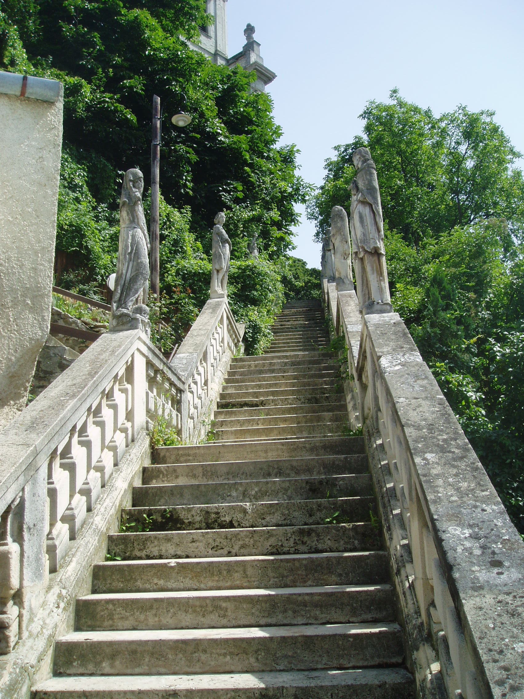 Nyilvános 1035 | 2621 | Sopronbánfalva: Kolostorhegy út: Karmelita templom és kolostor | Sopronbánfalva fölött a Sopronból Brennbergbányára vezető út déli oldán magas domb emelkedik. A dombot uraló gótikus eredetű, első formájában a XV. század végén épült templom és a hozzá csatlakozó barokk kolostorszárnyak eredetileg pálos szerzetesek, majd karmelita apácák otthona volt. Az épületegyüttest a település központjával a meredek domboldalban egyenesen húzódó díszes lépcső köti össze, amelyet karmelita-, vagy pálos lépcsőként ismer a köztudat. A lépcső hét lépcsőkarból és hét pihenőből áll. A pihenőkön, a baluszteres mellvéden jobbról-balról egy-egy szent kőszobra áll. A kép 2008 júniusában készült. Felh. irod.: Czellár Katalin: Sopron. 3. jav. kiad. Bp. Panoráma, 2000 |