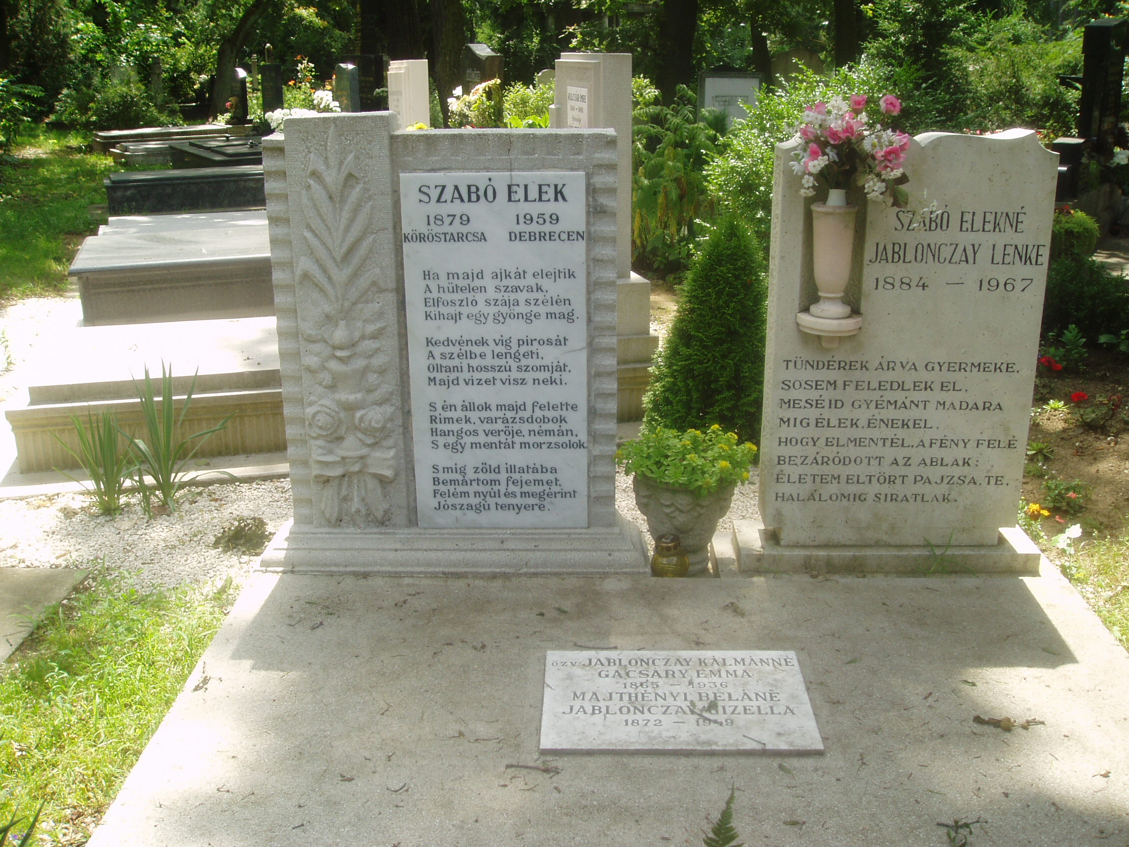 Nyilvános 1421 | 4242 | Debrecen, Bocskai út, Köztemető: Szabó Elek, Jablonczay Lenke és Szabó Magda sírja | Debrecen új köztemetőjét 1932-36 között alakították ki. A temetőkertet és a nagy művészettörténeti értéket képviselő ravatalozó épületét Borsos József tervezte. Ebben a temetőben nyugszanak Szabó Elek és Jablonczay Lenke, Szabó Magda Kossuth-díjas író szülei. Ők egyúttal az írónő több dokumentum-regényének, illetve regényének hősei is (Ókút, Régimódi történet, Für Elise). A sírkő tanúsága szerint ugyanebben a sírban nyugszik Gacsáry Emma, Jablonczay Lenke édesanyja és Jablonczay Gizella, Jablonczay Lenke nagynénje. Ők ugyancsak ismerősek Szabó Magda említett könyveiből. 2007. december 1-je óta Szabó Magda, Debrecen díszpolgára hamvai is itt nyugszanak. Az írónő november 19-én, életének 91. évében hunyt el. Végakaratának megfelelően hamvai egy részét a budapesti Farkasréti temetőben férje, Szobotka Tibor sírjában helyezték nyugalomra. A fénykép 2006 júniusában készült. |