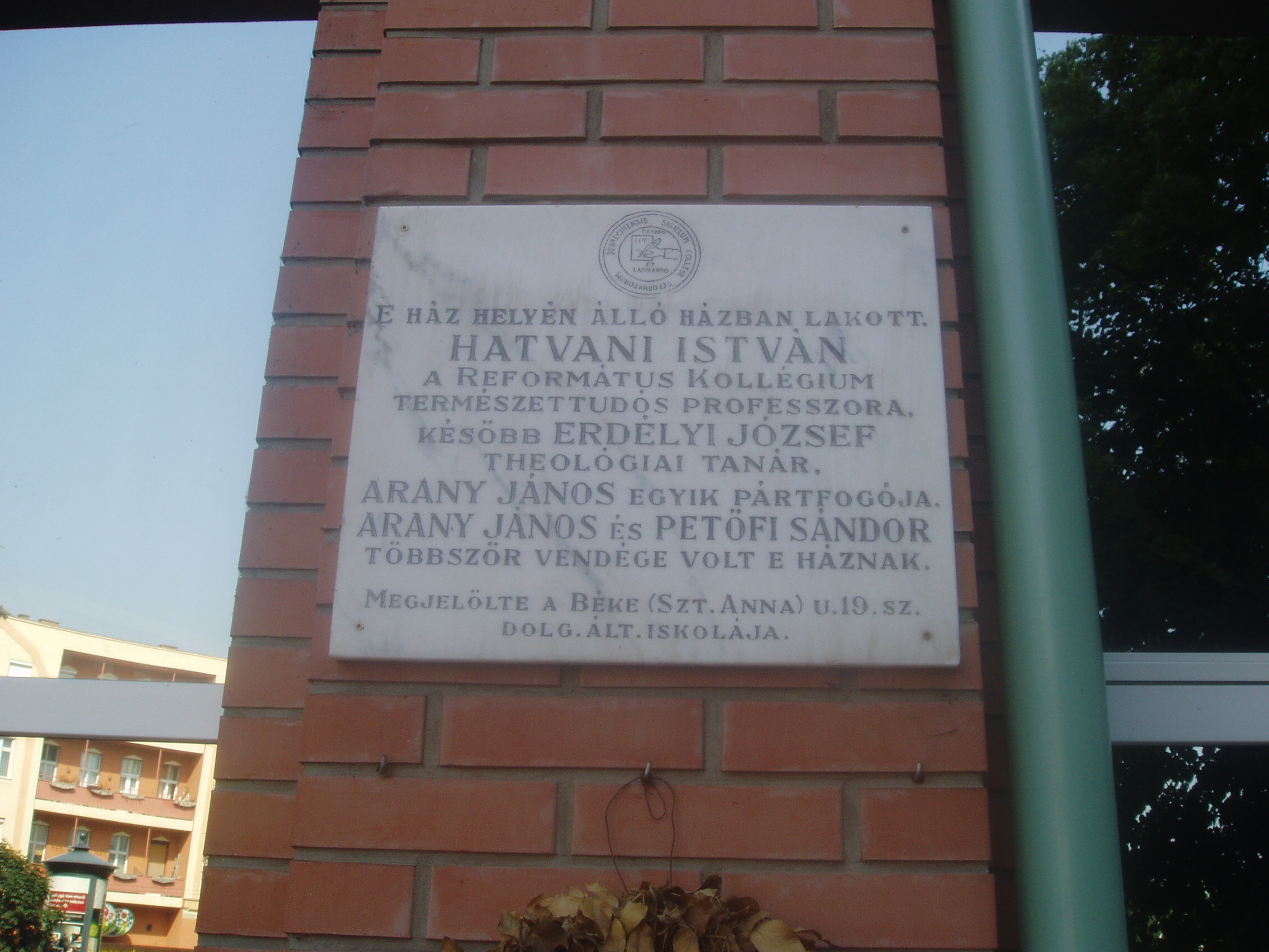Nyilvános 1045 | 1522 | Debrecen, Kálvin tér 11. | A városháza új épületének helyén, a Péterfia utca Kálvin térbe torkolló részén egykor a Kollégium professzorainak házai álltak, amelyeket sajnos az 1900-as évek közepén bontottak le. A ház első lakója az 1740-es évek első felében Maróthi György, a debreceni Kollégium (lásd: Debrecen, Kálvin tér 16.) fiatal matematikaprofesszora volt, aki a zenéhez is kiválóan értett. Ő alapította meg hazánkban az első többszólamú kórust, a ma is működő Debreceni Kántus elődét. A fiatal professzor itt hunyt el rövid, súlyos betegség után vérhasban 1744. október 16-án. Még nem volt harminc éves. Nem sokkal később ugyanitt lakott Hatvani István (Rimaszombat, 1718. november 21. – Debrecen, 1786. november 16. ) orvos, természettudós, a debreceni Kollégium legendás professzora, "a magyar Faust". Magyarországon ő volt az első, aki tanítás közben fizikai kísérleteket mutatott be. 1757-ben a csillagászat törvényeinek segítségével meghatározta Debrecen városának földrajzi fekvését. Orvosként is nagy híre volt, gyakran meglepő módszereket használt a korabeli orvosláshoz képest. Debrecenben hunyt el 1786-ban; sírköve a debreceni Református Kollégiumban látható. Kéziratait, fizikai eszközeit is a Kollégium őrzi. Varga Imre kitűnő, Hatvani István személye által inspirált szobrát - "A professzor" - a Nagyerdőben, az Egyetemhez közel helyezték el (egy másolata Siófok városközpontjában is látható). "A magyar Faust" szépirodalmi művek ihletője is lett. Arany János 1855-ben verset írt róla. Jókai Mór nagy hatású regényében, az És mégis mozog a földben is szerepelteti a professzor legendás alakját. Ugyancsak lakott a lebontott épületben Erdélyi János (1814-1869) kollégiumi tanár, költő, író, kritikus, filozófus, esztéta, magyar népköltés-gyűjtő. Ő volt a fiatal Arany János egyik pártfogója, akinél debreceni lakásán látogatóban többször is járt Arany és Petőfi Sándor. A fénykép 2006 júniusában készült. Felh. irod.: Papp Antal: Debrecen. Bp. Panoráma, 1976 Kovács Gergelyné: Debrecen. Bp. Panoráma, 1981 Tóth Béla: Maróthi György. Debrecen, 1994 Gyarmati Borbála: Hatvani István (1718-1786) a XVIII. századi magyar mûvelõdéstörténet nagy alakja,a debreceni Kollégium híres polihisztor tanára. = www.atomki.hu/Hatvani/ |
