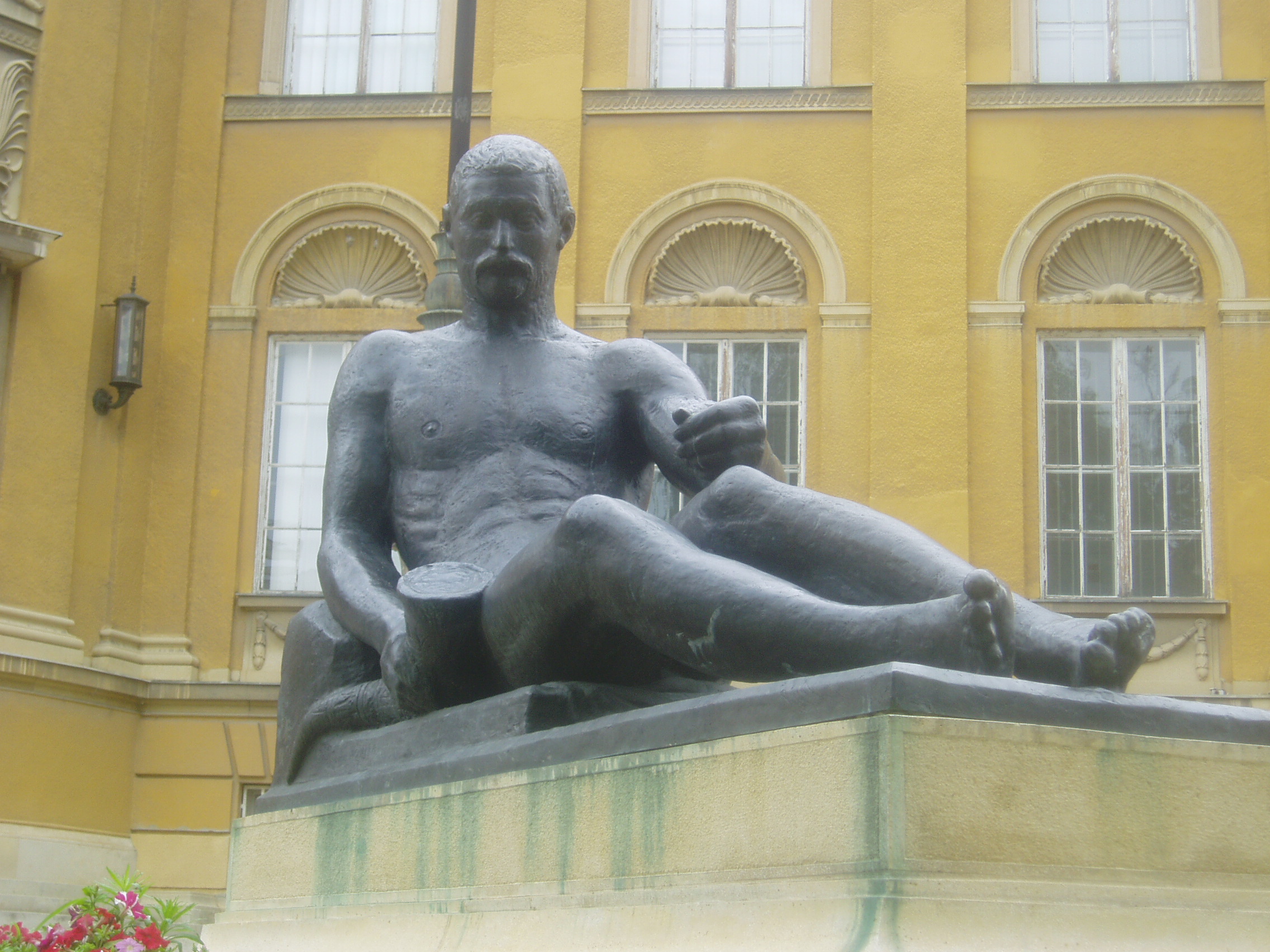 Nyilvános 1069 | 1737 | Debrecen, Déry tér. Medgyessy Ferenc: Néprajz | A Déri Múzeum előtt az épülettel kellemes összhangban állnak Debrecen nagy szülöttének, Medgyessy Ferencnek nagyméretű, allegorikus bronzszobrai: Régészet, Történelem, Művészet, Néprajz. A képen a Néprajz megjelenítőjének szobra látható: faragott pásztorkürtöt tartó mosolygó, bajuszos férfialak, amelynek modelljéül Medgyessy önmagát választotta. A szobrok a tervezéssel együtt egy év alatt készültek el, 1930-ban avatták fel őket. 1937-ben eljutottak a párizsi világkiállításra, ahol Medgyessy Grand Prix-t, nagydíjat kapott. Ez a díj a XX. századi magyar szobrászat európai rangra növekedését jelentette. A fénykép 2006 júniusában készült. Felh. irod.: Papp Antal: Debrecen. Bp. Panoráma, 1976 Kovács Gergelyné: Debrecen. Bp. Panoráma, 1981 |