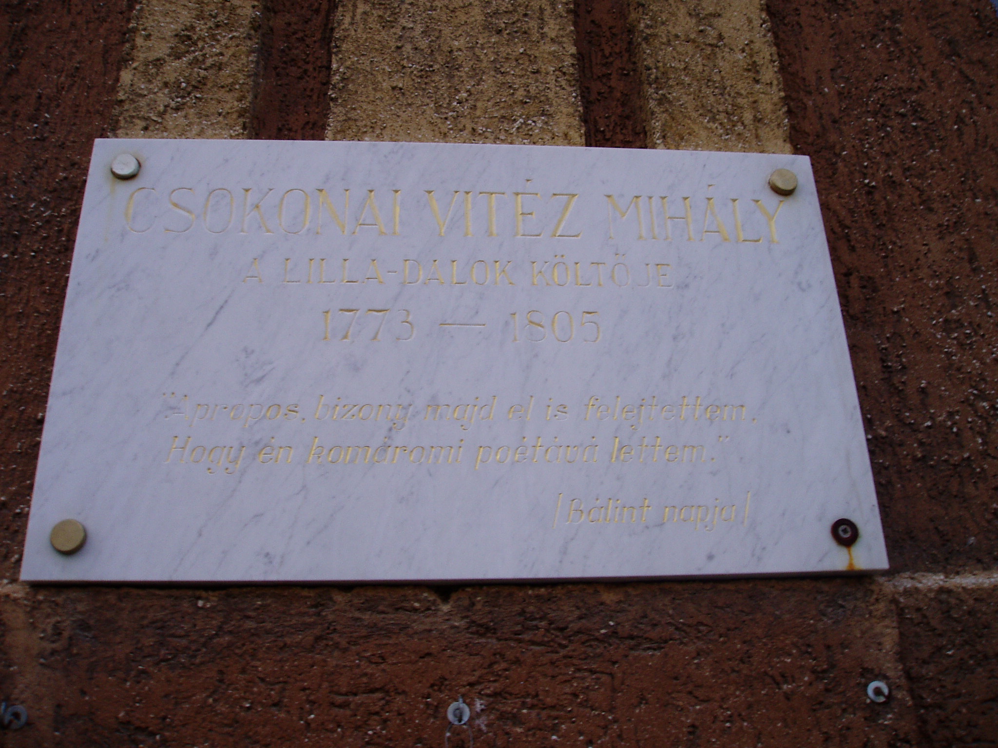 Nyilvános 1422 | 3688 | Komárom (Komárno), Jókai u. Református Kollégium, Csokonai Vitéz Mihály emléktáblája | A református templommal szemben, tágas udvar közepén áll a volt Református Kollégium történelmi épülete. Az egyemeletes, hatalmas tetőzetű, kis bádogtornyú épület 1796. december 28-án készült el. A "múzsáknak állított" iskolaépület ünnepélyes megnyitására 1797. január 2-án került sor. A komáromi kollégium - tudós tanárai révén - rövidesen olyan hírnévre tett szert, hogy nem csupán a Komárom megyei fiatalok tanultak itt, hanem számosan a szomszédos és távolabbi megyékből is. Itt kezdett iskolába járni 1831 őszén a kis Jókai Mór is. A kollégium másik irodalomtörténeti nevezetessége, hogy itt az udvaron látta meg először Csokonai Vitéz Mihály Vajda Juliannát 1797. április 26-án. Csokonai 1797 február közepén utazott Komáromba a megye első szolgabírója, Laky Bálint kérésére, aki biztatta, hogy ott a költő próbálja meg újraéleszteni a Mindenes Gyűjtemény c. folyóiratot. Akkoriban történt, hogy a Napóleon elleni háborúhoz hadba szállt a magyar nemesség is. A Komáromban gyülekezőkhöz Csokonai lelkesítő ódát írt "A nemes magyarságnak felülésére" címmel. Ezt a verset 1797. április 26-án, a Református Kollégium udvarán a város legszebb lánya, Vajda Julianna szavalta el. Ekkor személyesen még nem ismerkedtek meg, arra valamivel később, Bédi János és felesége, Fábián Julianna költőnő házánál került sor. Csokonai így írt "A fogadástétel" c. versében: Egy nyári este Lillát, A gyenge rózsaszájú, A tűzszemű leánykát Megláttam, és azonnal Látnom, szeretnem - egy vólt. A fénykép 2005. júliusában készült. Felh. irod.: Mácza Mihály: Komárom nevezetességei. Pozsony, Madách-Posonium, 2002 Bertók László: Így élt Csokonai Vitéz Mihály. Bp. Móra Kiadó, 1977 Csokonai emlékek. Szerk. Vargha Balázs. Bp. MTA Irodalomtudományi Intézet, 1960 |