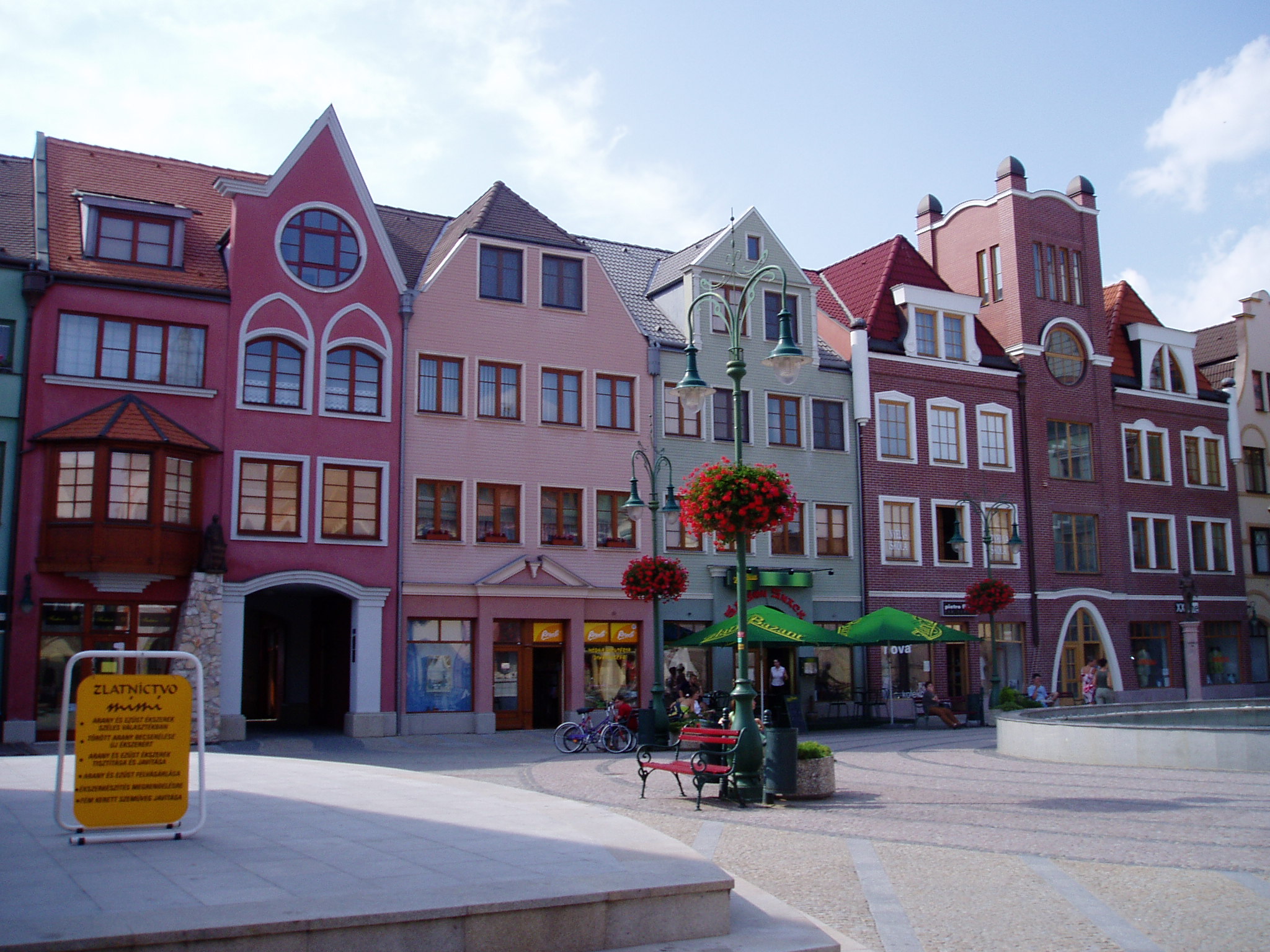 Nyilvános 1454 | 4728 | Komárom (Komárno), Európa udvar | A közelmúltban a Zichy–palota (lásd: Klapka tér 9.) udvarán építették ki az ún. Európa udvart. A helyi viszonylatban gigantikus méretű vállalkozás célja, hogy élőben mutassa be harmincöt európai ország építészetét. A városrész egyben Komárom új szolgáltató központja is, üzletekkel, éttermekkel, kávézókkal, valamint egy föld alatti bevásárlóközponttal. A fénykép 2005. júliusában készült. Felh.irod.: www.komarno.sk Mácza Mihály: Komárom nevezetességei. Pozsony, Madách-Posonium, 2002 |