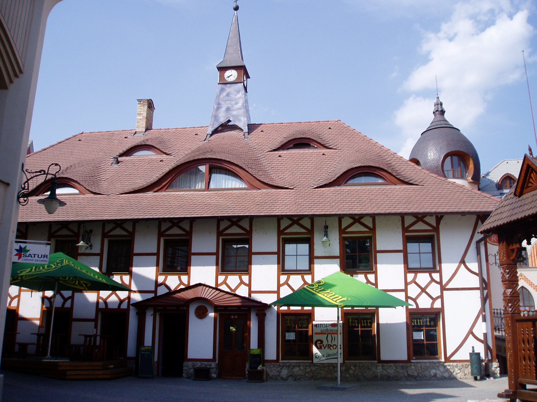 Nyilvános 1416 | 4680 | Komárom (Komárno), Európa udvar | A közelmúltban a Zichy–palota (lásd: Klapka tér 9.) udvarán építették ki az ún. Európa udvart. A helyi viszonylatban gigantikus méretű vállalkozás célja, hogy élőben mutassa be harmincöt európai ország építészetét. A városrész egyben Komárom új szolgáltató központja is, üzletekkel, éttermekkel, kávézókkal, valamint egy föld alatti bevásárlóközponttal. A fénykép 2005. júliusában készült. Felh.irod.: www.komarno.sk Mácza Mihály: Komárom nevezetességei. Pozsony, Madách-Posonium, 2002 |