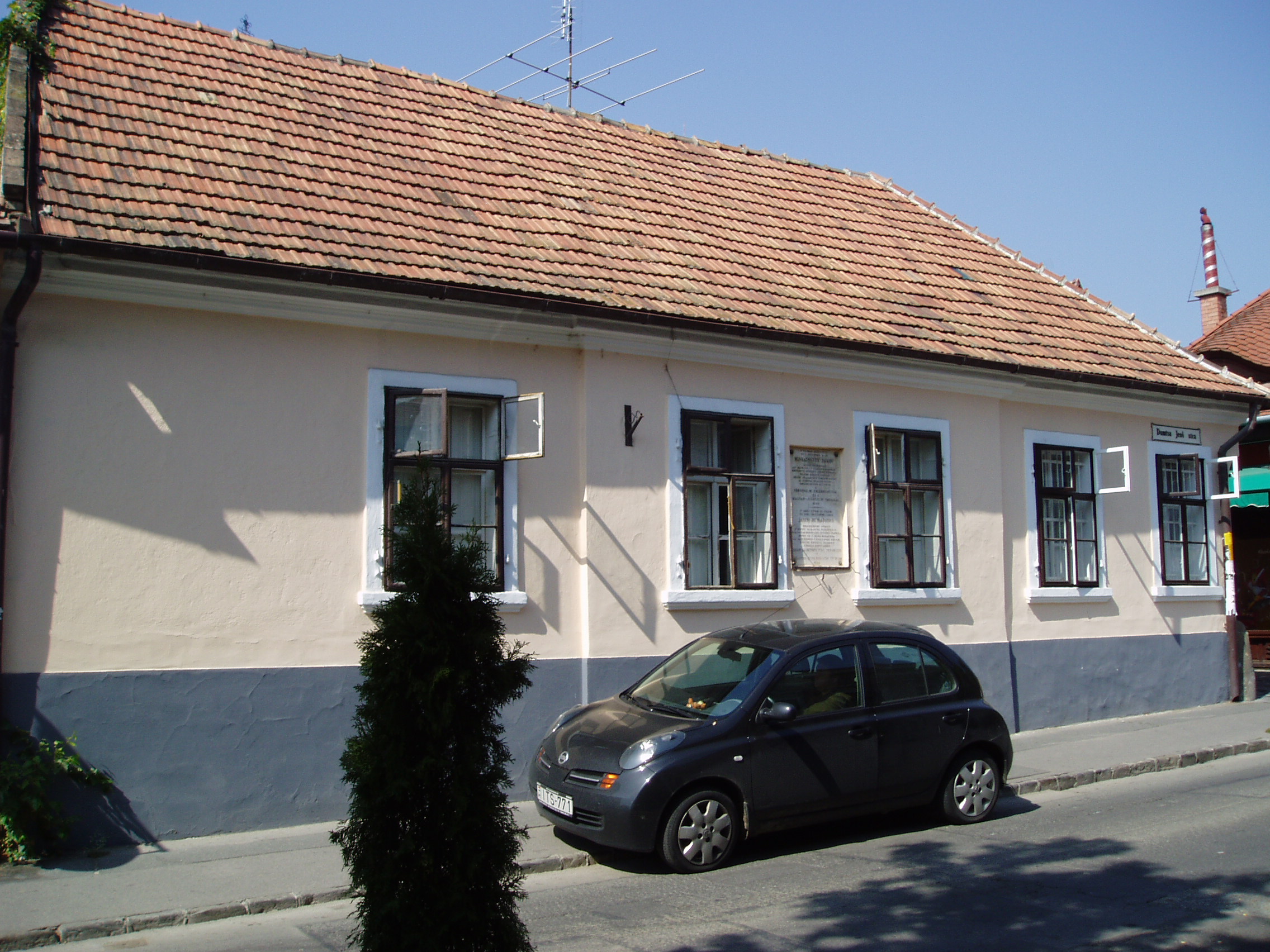 Nyilvános 1065 | 1727 | Szentendre, Dumtsa Jenő utca 5/A | Az utca 1897-ben kapta mai nevét a görög származású gazdag kereskedőről és földbirtokosról. 1871-től ő volt a város főbírója és 1872-től a rendezett tanácsú város első polgármestere. Az 5/A számú ház egyszerű, nyeregtetős barokk lakóház. Ebben a házban született 1822-ben Ignatovity Jakob (1822-1889), a szerb realista regényírás megteremtője. A fiatalember Pesten jogot hallgatott és 1848. március 15-én a Nemzeti Múzeum előtti népgyűlésen a közös forradalom szónoka volt. Társadalmi regényei közül az Örök vőlegény és a Respektus Vásza címűek kötődnek Szentendréhez. Bennük ábrázolja korának és városának szerb nemzetiségű társadalmát. A fénykép 2005 szeptemberében készült. Felh. irod.: Szentendre. Szerk. Sándyné Wolf Katalin. Bp. Panoráma, 1985 |