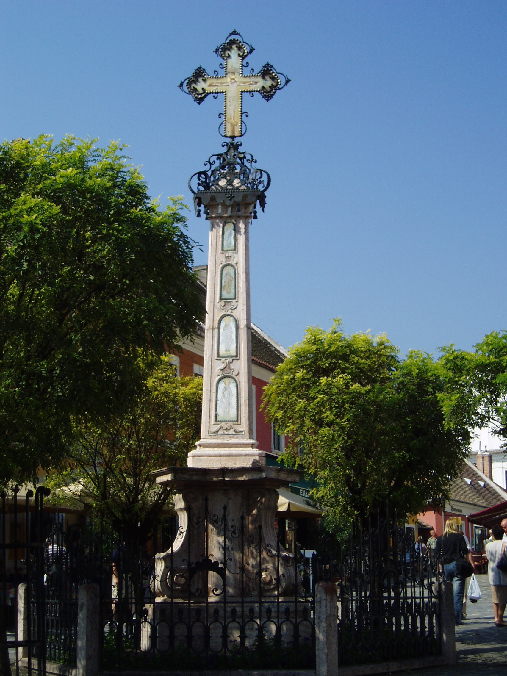Nyilvános 1044 | 2053 | Szentendre, Fő tér: a Kereskedő Társaság emlékkeresztje | A keresztet az 1698-ban alakult szerb kereskedő társaság emeltette 1763-ban, nagy építkezései befejezésének évében, hálából, hogy a nagy pestisjárvány elkerülte a várost. A kereszt vörös mészkőből készült, gazdag rokokó faragványokkal, kovácsoltvas díszítésekkel és vaslemezre festett ikonok ékesítik. A néphagyomány azt tartja, hogy fejjel lefelé eltemetett ember van alatta, hogy a pestis elő ne tudjon bújni a föld alól. A fénykép 2005 szeptemberében készült. Szentendre. Szerk. Sándyné Wolf Katalin. Bp. Panoráma, 1985 www.szentendre.hu |