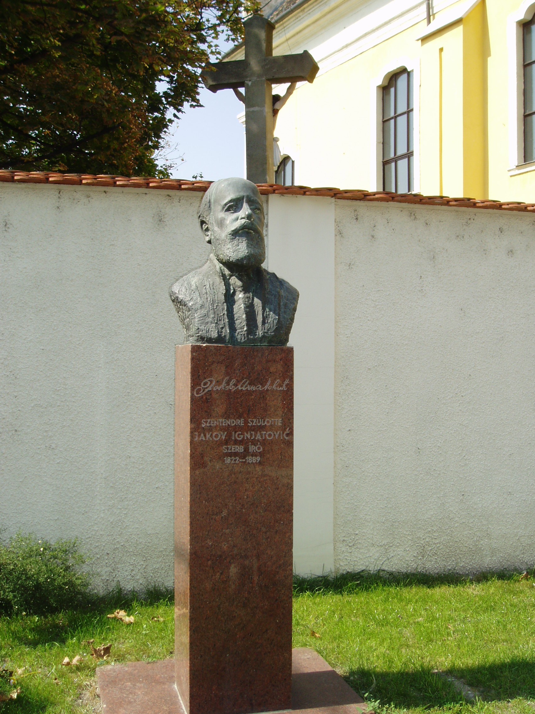 Nyilvános 1049 | 2089 | Szentendre, Ignatovity köz | A szülőháza (lásd: Szentendre, Dumtsa Jenő u. 5/A) melletti kis közt 1958-ban a neves szerb regényíróról, Ignatovity Jakobról nevezték el. Mellszobrát, Janzer Frigyes alkotását 1977-ben helyezték el itt, a Péter-Pál templom előtt. Ignatovity Jakob (1822-1889), a szerb realista regényírás megteremtője. A fiatalember Pesten jogot hallgatott és 1848. március 15-én a Nemzeti Múzeum előtti népgyűlésen a közös forradalom szónoka volt. Társadalmi regényei közül az Örök vőlegény és a Respektus Vásza címűek kötődnek Szentendréhez. Bennük ábrázolja korának és városának szerb nemzetiségű társadalmát. A fénykép 2005 szeptemberében készült. Felh. irod.: Szentendre. Szerk. Sándyné Wolf Katalin. Bp. Panoráma, 1985 |