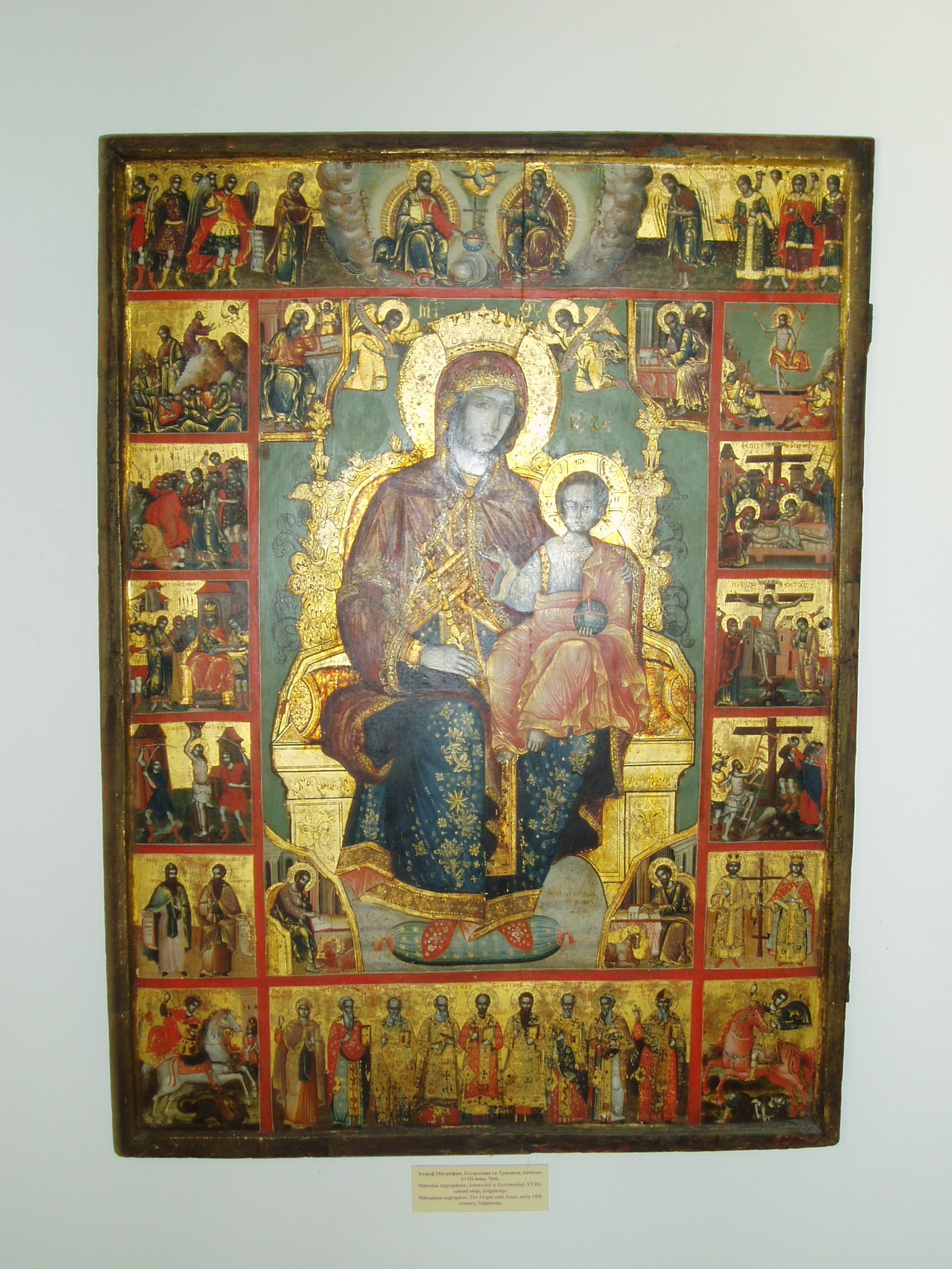Nyilvános 1112 | 2444 | Szentendre, Pátriárka utca 5. Szerb Egyházművészeti Gyűjtemény | A Beográda-templom - a görögkeleti (ortodox) püspöki székesegyház - kertjében áll a püspöki palota és a szerb egyházművészeti múzeum épülete. Magyarország művészeti emlékeinek egyedülálló színfoltja a XVI.-XIX. századi szerb egyházművészeti emlékeket, ikonokat, ötvösmunkákat és más iparművészeti alkotásokat bemutató Szerb Egyházművészeti Gyűjtemény. A múzeum törzsanyaga a Budai Szerb Ortodox Püspökség kincstárából és a hazai szerb templomokból Szentendrére került kiemelkedő jelentőségű műtárgyakból alakult ki. A közelmúltban felújított épületbe került a Budai Szerb Püspökség könyvtára és levéltára is, mely szerb ősnyomtatványokat és egy török nyelvű kiváltságlevelet is tartalmaz. A képen a görög Mitrofan és társa: Isten anyja a gyermekkel és a szenvedéstörténet eseményeivel című, a XVIII. század elejéről származó ikonja látható, amely eredetileg a szigetcsépi templomé volt. A fénykép 2005 szeptemberében készült. Felh. irod.: www.szentendre.hu |