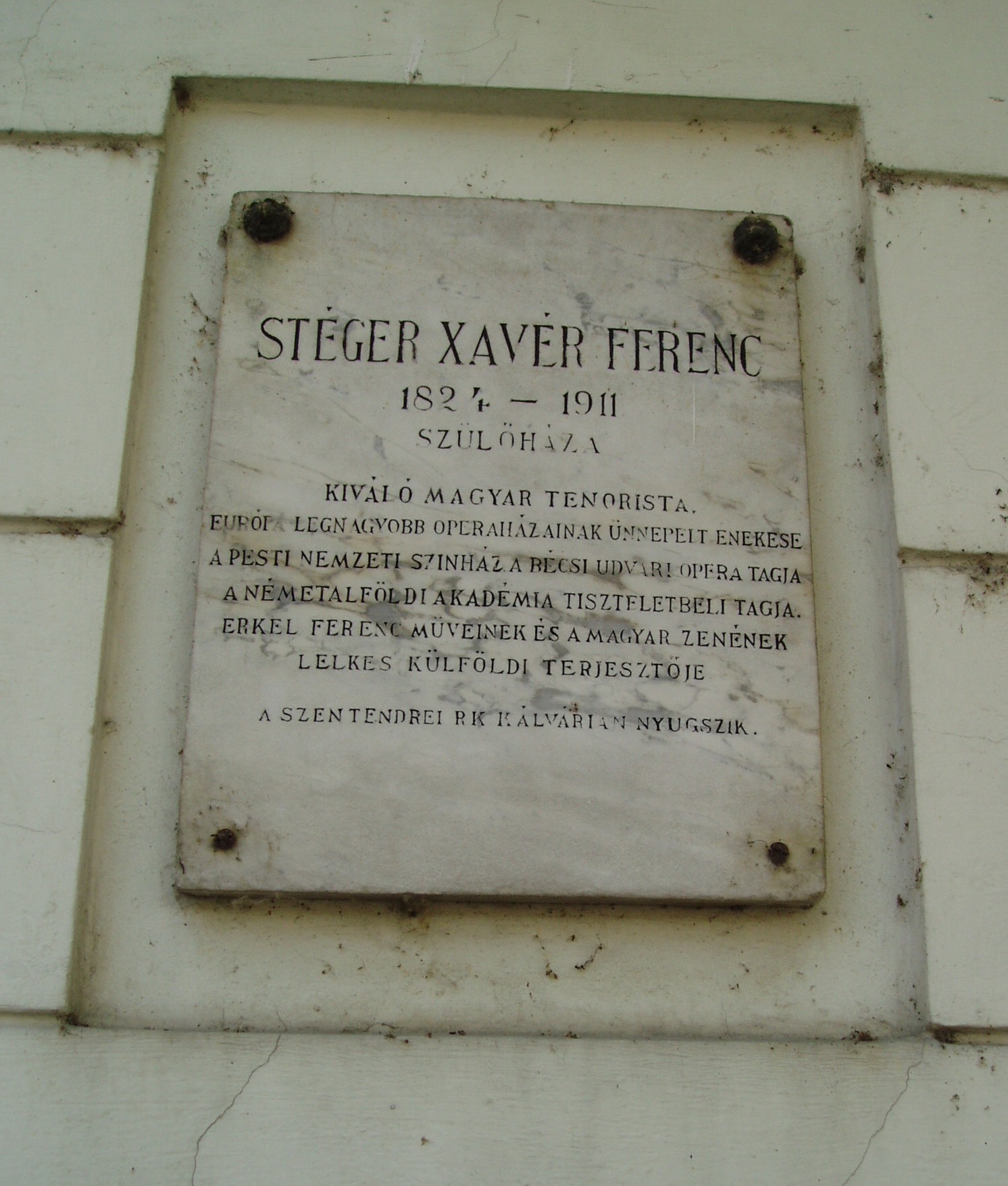 Nyilvános 1139 | 1836 | Szentendre, Dumtsa Jenő utca 10. | A XIX. zázadban épült polgárház 1978 óta a Barcsay Múzeum otthona. Barcsay Jenő (1900-) 1929-ben jött először Szentendrére, s azóta az év egy részét itt töltötte. Ezt írta a város szerepéről életében és művészetében: "Szentendrén éltem és Szentendrén alakítottam ki festészetemet, azt a valamit, amiért nekem érdemes volt küzdenem és élnem. A Szentendrén látott dolgokban, a természetben látott jelenségekben élet van, művészet van. Élnek azok a formák, színek, vonalak, amelyeket csak festő vehet észre..." A ház másik nevezetessége, hogy 1824. december 3-án itt született Stéger Ferenc (1824-1911) operaénekes. A patikusnak tanult fiatalember Európa–szerte híres hőstenorrá vált: rendszeresen vendégszerepelt Prágában, Bécsben, de énekelt Barcelonában, Bukarestben és Itália több színházában. 1848–1852 és 1873–1874-ben a pesti Nemzeti Színház tagja volt, Erkel színpadi hőseinek, valamint a francia és olasz tenorszerepeknek utolérhetetlen megszólaltatója. Élete alkonyán szülővárosába vonult vissza, itt hunyt el; a Katolikus Kálvária kertjében nyugszik. A fénykép 2005 szeptemberében készült. Felh. irod.: Szentendre. Szerk. Sándyné Wolf Katalin. Bp. Panoráma, 1985 Pethő Németh Erika- G. Sin Edit: Írók, költők Szentendrén. Szentendre, 1990 Erkel Ferencz emlékkönyv. Szerk. Fabó Bertalan. Bp. Pátria, 1910 |