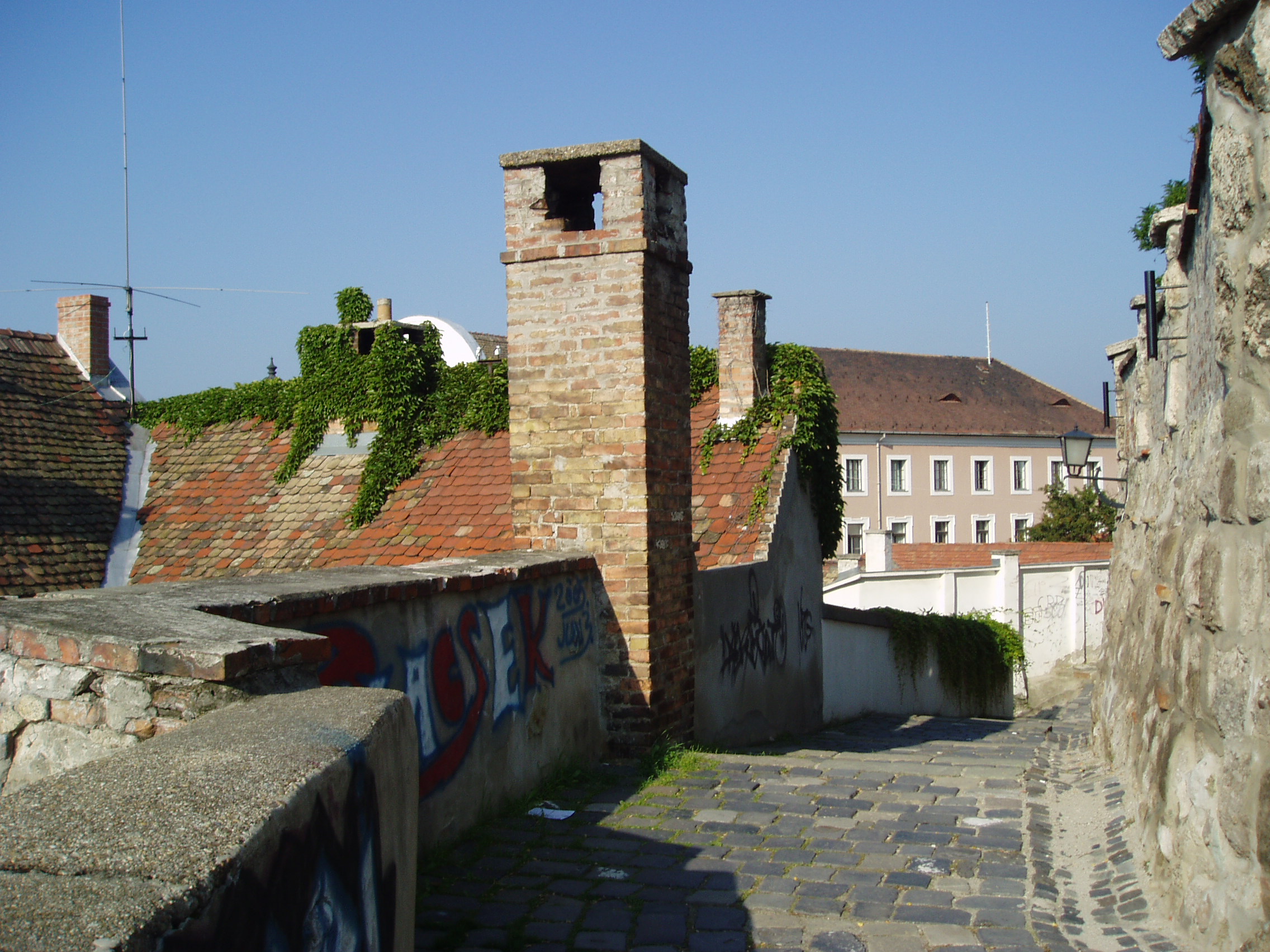 Nyilvános 1080 | 1979 | Szentendre, Várdomb | Szentendre egyik legszebb része a Várdomb, a település középkori központja. Tömör mellvéddel körülvett sétányáról megragadó látvány nyílik az oly sokszor megfestett szentendrei háztetőkre, a kis belső udvarokra, a belvárosra, a Dunára és a túloldali szigetre. A fénykép 2005 szeptemberében készült. Felh. irod.: Szentendre. Szerk. Sándyné Wolf Katalin. Bp. Panoráma, 1985 www.vendegvaro.hu www.szentendre.hu |