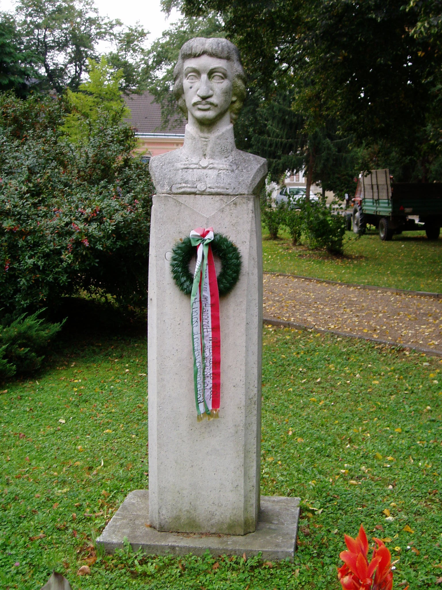 Nyilvános 1141 | 2422 | Csurgó, Széchenyi tér: Csokonai mellszobra | Csokonai Vitéz Mihály 1799/1800-ban helyettesítő tanárként tanított a nem sokkal korábban alapított csurgói gimnáziumban (lásd: Csurgó, Csokonai u. 24.). Modern mellszobra Kamocsay István alkotása. A fénykép 2004 októberében készült. Felh. irod.: Csurgói kalauz. Szerk. Terényi Zoltán. 1974 |
