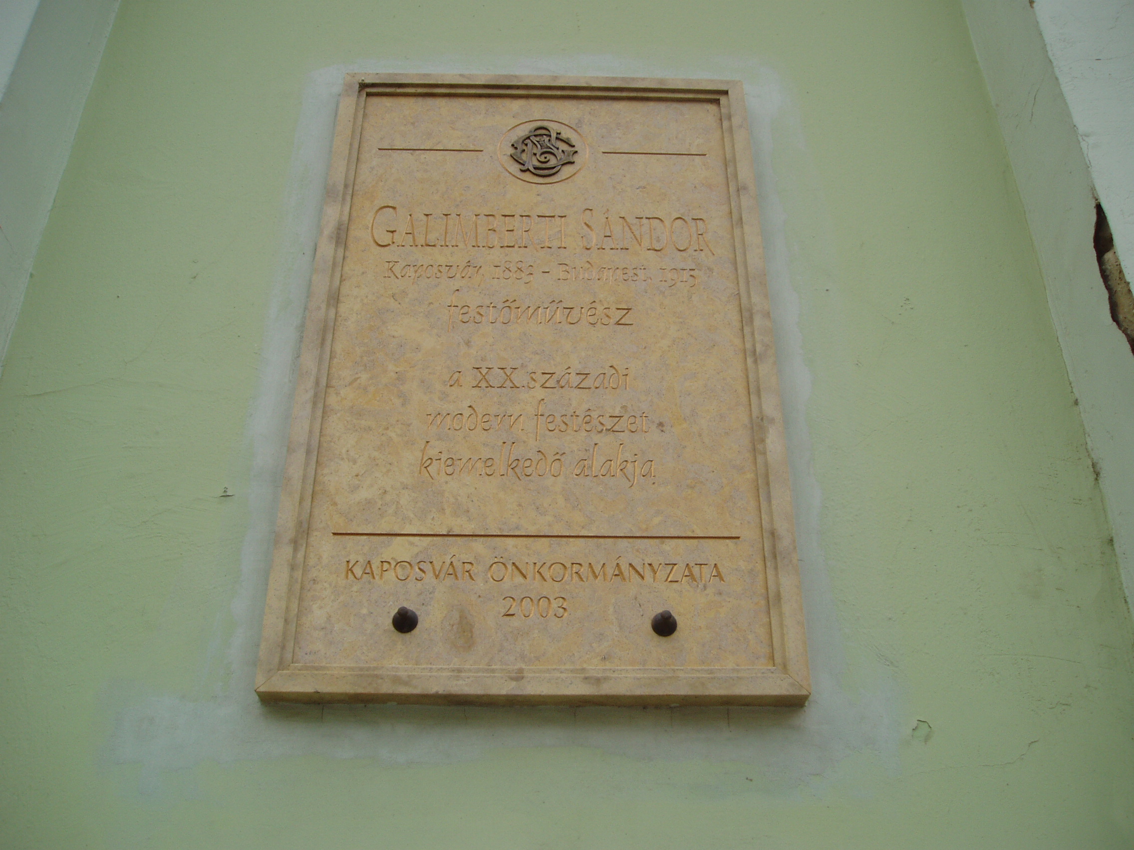 Nyilvános 1101 | 2016 | Kaposvár, Fő utca 2. | A régi gimnázium, majd pénzügyi palota épületén 2003-ban helyezték el a kaposvári születésű Galimberti Sándor festőművész emléktábláját. Galimberti Sándor (1883-1925) a magyar festőművészet első vonalbeli alakjaként a századelő megújító művészeti képviselőihez tartozik. Édesapja Galimberti Alajos (Luigi Galimberti) az 1880-as évek elején települt át Trieszből Kaposvárra. Ő maga is festő volt, aki szívesen örökítette meg a kisvárosi lakók életét rajzaiban, illetve Kaposvár egykori képéről két festménye maradt fenn. Galimberti Sándor pályája nagyobb ívet rajzolt be. Ő a modern európai festészeti eredményeket adaptálta művészetében és a művészettörténet ennek eredményeként a kubofuturista és expresszionista felfogás első hazai képviselőjének tartja. Galimberti nagybányai, müncheni, majd párizsi iskolái után saját stílusát tekintve Rippl-Rónai festészetének szellemében indult és a kaposvári mestert e progresszív, új művészeti irányzatokkal kapcsolja össze. Sajnos műveinek többsége a világháborúban megsemmisült, csak néhány darab maradt fenn, amelyből a művészettörténészek rekonstruálni tudták pályáját. Hagyatékának nagyobb részét a Rippl-Rónai Múzeum birtokolja. A fénykép 2006 márciusában készült. Felh. irod.: www.kaposvar.hu/eloterjesztesek/eloterjesztesek20030227/kotet3/18.doc |