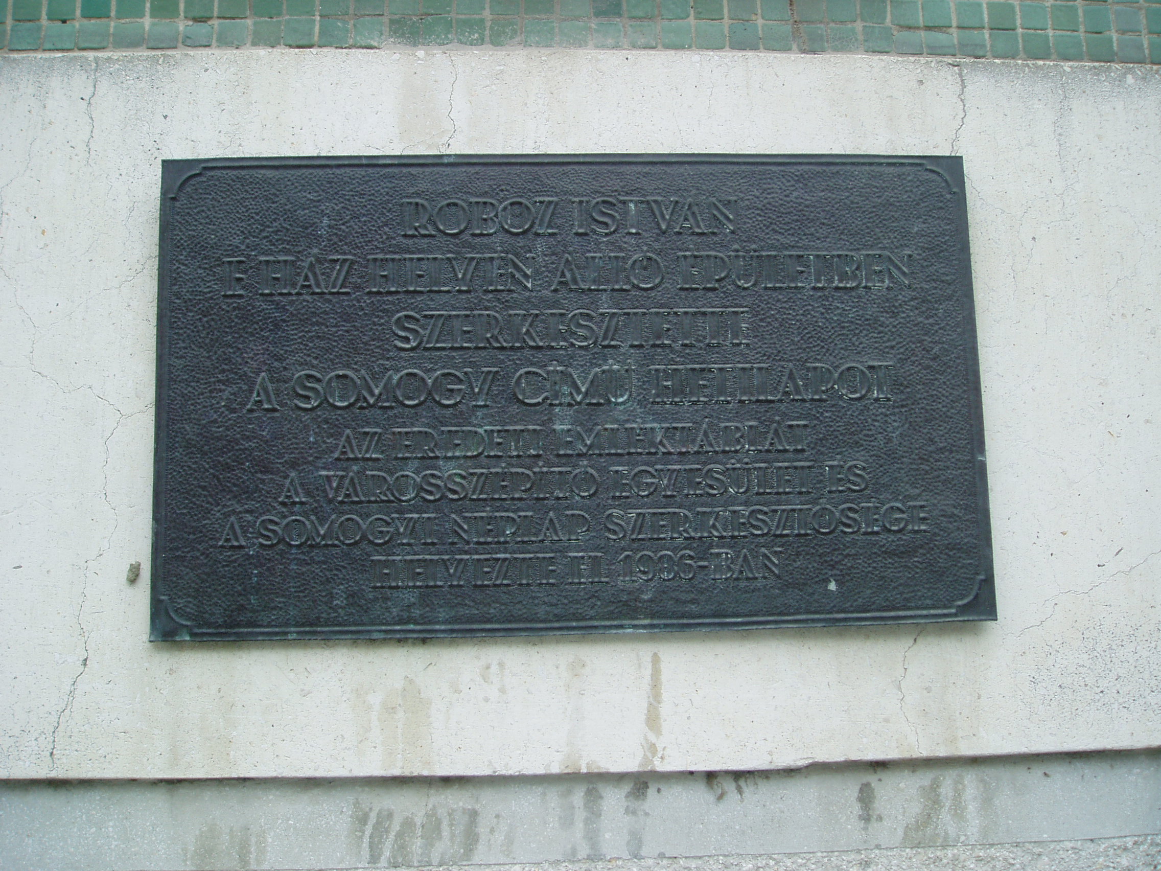 Nyilvános 1088 | 1849 | Kaposvár, Dózsa utca 16. | A korábban ezen a helyen állott házban lakott 1892-től 1916-ban bekövetkezett haláláig Roboz István író, szerkesztő. Halála után az eredeti épületet emléktáblával jelölték meg, amelyet 1996-ban áthelyeztek az itt felépített új épületre, egy kiegészítő szöveges táblával együtt. Roboz István (Kötcse, 1828. okt. 26. - Kaposvár, 1916. ápr. 11.): költő, író, újságíró. Pápán Petőfi és Jókai iskolatársa volt. Diákéveit "Petőfi Sándor és az én pápai emlékeim" című, forrásértékű visszaemlékezéseiben örökítette meg. A szabadságharc alatt kormánybiztosi titkár Kaposvárott. Végleg 1856-ban telepedett le a városban, ahol először törvényszéki bíróként, később főjegyzőként dolgozott. Nagy aktivitással kapcsolódott be a dél-dunántúli irodalmi életbe. 1866-ban megalapította a Somogy című lapot, amelyet haláláig szerkesztett. Elnöke volt a Somogy vármegyei Berzsenyi Társaságnak. Ő írta - a hagyomány szerint az ádándi kastélyban - 1849-ben a később több nyelvre is lefordított "Kossuth imája a kápolnai csatában elesettek felett" című verset, amelyet a helyszínen felolvasott Wesselényi Miklósnak és Kemény Zsigmondnak. Az ima az 1850-es években a legismertebb hazafias fohász volt. A fénykép 2006 márciusában készült. Felh. irod.: Életrajzi lexikon www.adand.hu |
