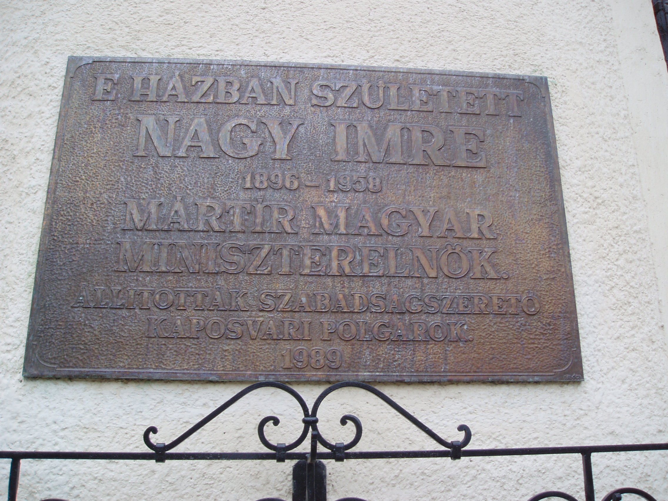 Nyilvános 1080 | 1838 | Kaposvár, Fő utca 77. | Kaposvár hosszú főutcájának a városközponttól távolabbi részén ma is álló kis házban született Nagy Imre mártír miniszterelnök 1896. június 7-én. Emléktábláját 1989-ben, rehabilitálásának évében helyezték el. 1996-ban, a forradalom 40. évfordulójára szobrot is állítottak emlékére a Megyeháza előtt, az 56-os emlékmű mellett (Paulkovics István alkotása). Nagy Imre református szegényparaszti családból származott. Apja postai szerelőmunkás volt. Anyja, mielőtt férjhez ment volna, a somogyi alispánnál cselédlányként szolgált. Tanulmányait a 4 elemi (lásd: Kaposár, Fő u. 44.) és a 4 polgári osztályig végezte, mert 1912-ben saját elhatározásból elhagyta kaposvári gimnáziumot és géplakatos segédnek állt. A segédi oklevelet 1914-ben szerzete meg, majd a tanulmányait folytatandó beiratkozott a kaposvári felső kereskedelmi iskolába. Ezt már nem tudta elvégezni, mert 1915 májusában behívták katonának. A Monarchia katonájaként 1918-ban az orosz fronton fogságba esett. Politikai pályafutása ekkoriban kezdődött el. A fénykép 2006 márciusában készült. Felh. irod.: Látnivalók Somogy megyében. Miskolc, Well-PRess, 2000 hu.wikipedia.org/wiki/Nagy Imre |