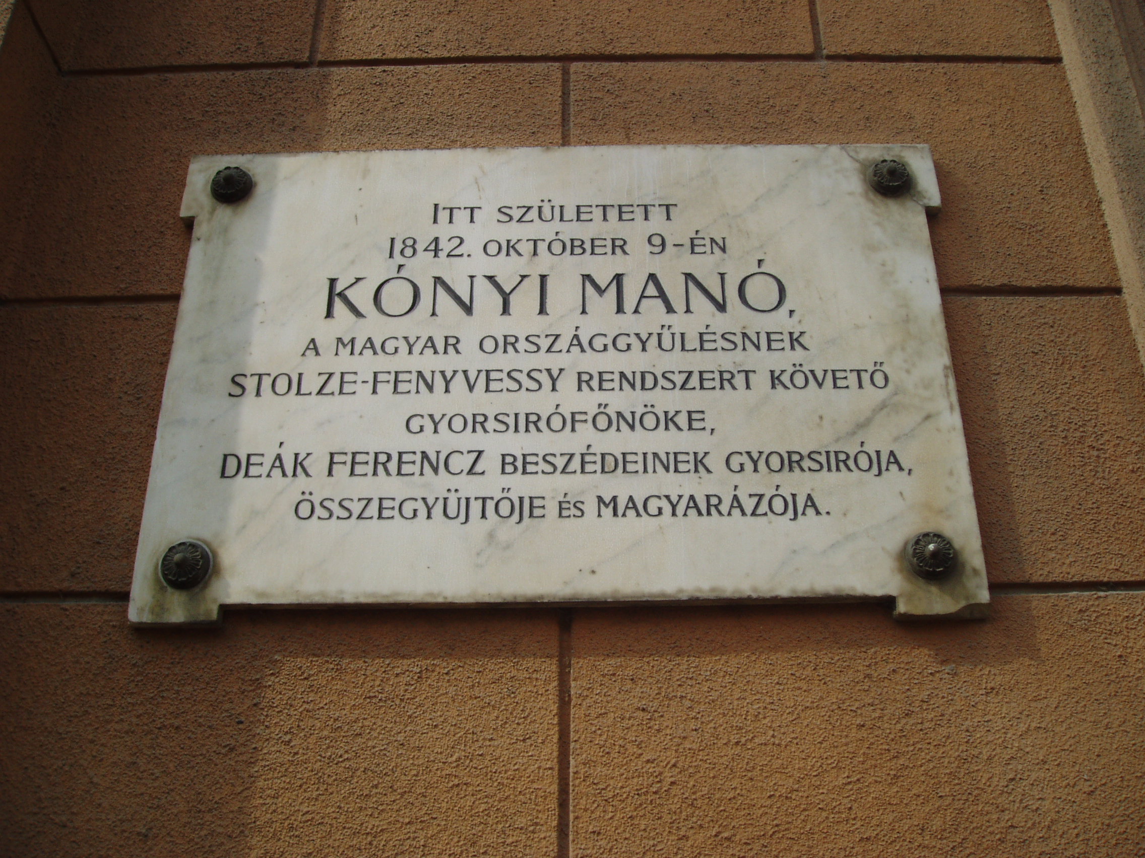 Nyilvános 1056 | 1738 | Kaposvár, Kossuth tér 5. | Az egykori Erzsébet szálló épületét 1901-ben hat hónap alatt készítették el. A sarokerkély feletti saroktorony, valamint a színes Zsolnay-cserepek a városközpont egyik jellegzetes épületévé teszik. A Noszlopy Gáspár utca felőli homlokzaton Kónyi Manó emléktáblája olvasható, aki a szálló helyén korábban állott épületben született. Szövege a következő: "Itt született 1842. október 9-én Kónyi Manó, a magyar országgyűlésnek Stolze-Fenyvessy rendszert követő gyorsírófőnöke. Deák Ferenc beszédeinek gyorsírója, összegyűjtője és magyarázója." A fénykép 2006 márciusában készült. Felh. irod.: Látnivalók Somogy megyében. Miskolc, Well-PRess, 2000 |