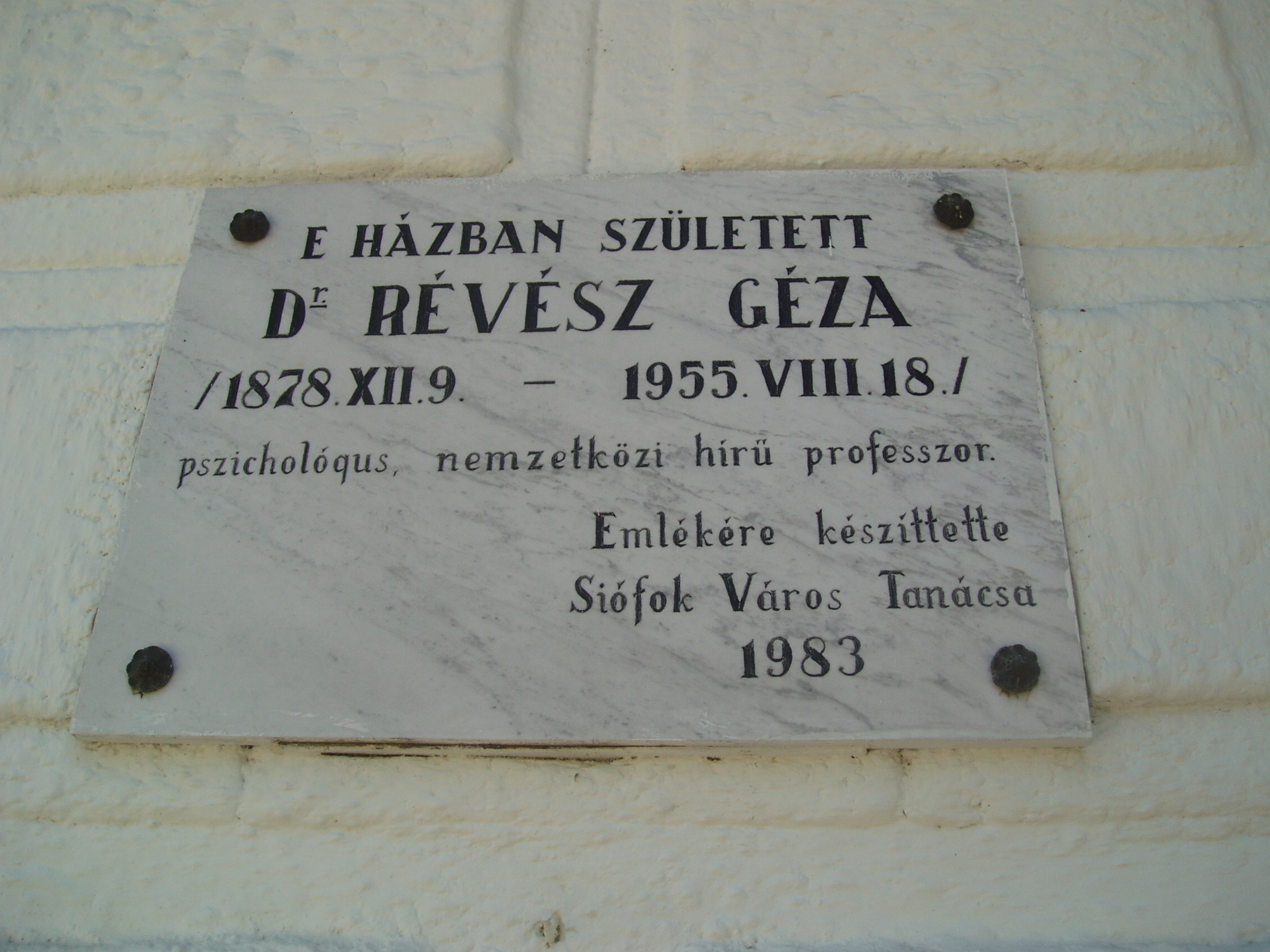 Nyilvános 1068 | 1932 | Siófok, Bajcsy-Zsilinszky utca 48. | 1878. december 9-én ebben a házban született Révész Géza pszichológus, nemzetközi hírű professzor. Elsősorban zenepszichológiával és hangfiziológiával foglalkozott. 1919-ben emigrált. 1921-től Amszterdamban működött, mint az ottani kísérleti lélektani intézet igazgatója. 1932-1950 között az amszterdami egyetemen a lélektan tanára volt. 1949-től a bajor tudományos akadémia tagja. A würzburgi egyetem díszdoktorává avatta. Amszterdamban hunyt el 1955. augusztus 18-án. A fénykép 2006 júliusában készült. Felh. irod.: Magyar életrajzi lexikon |