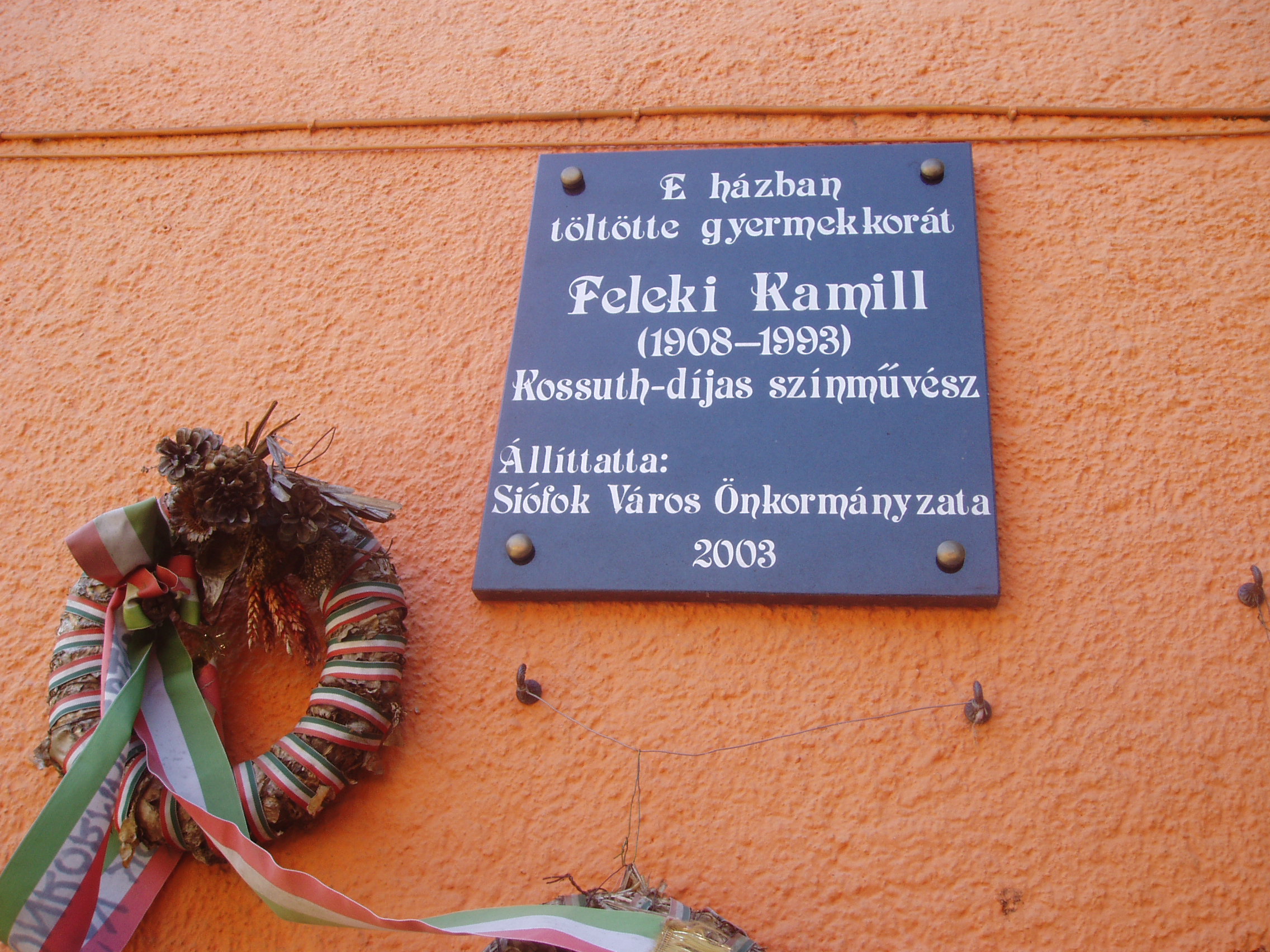 Nyilvános 1130 | 2235 | Siófok, Kálmán Imre sétány 3. | A város szívében, a sétálóutca központi részén található az egykori Kovács cukrászda, amely ma Siófok egyik legkellemesebb hangulatú étterme. Homlokzatán Feleki Kamillra, az operett műfajának kimagasló egyéniségére emlékező fekete márványtábla fogadja a sétálót, aki gyermekkorában ebben a házban töltötte nyarait testvéreivel együtt. A házban apai nagyszülei vezették az akkori vendéglőt. A fénykép 2006 júliusában készült. Felh. irod.: Matyikó Sebestyén József: Feleki Kamill és Siófok. = Siófoki Hírek 2003. júl. 23. |
