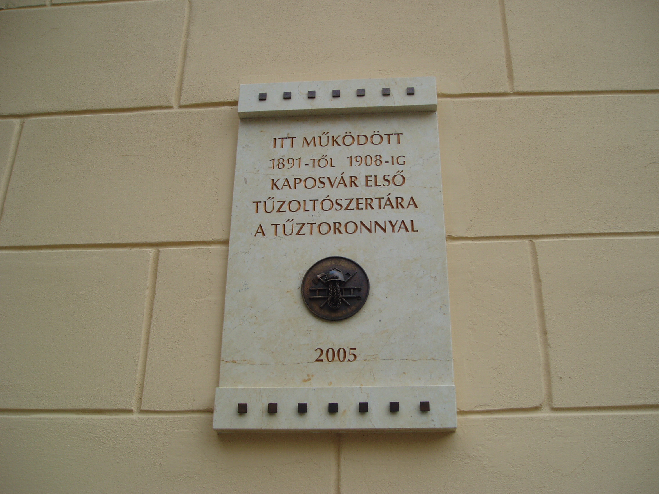Mint az épületen lévő emléktáblán is olvasható, itt működött 1891-1908 között Kaposvár első tűzoltószertára a tűztoronnyal.