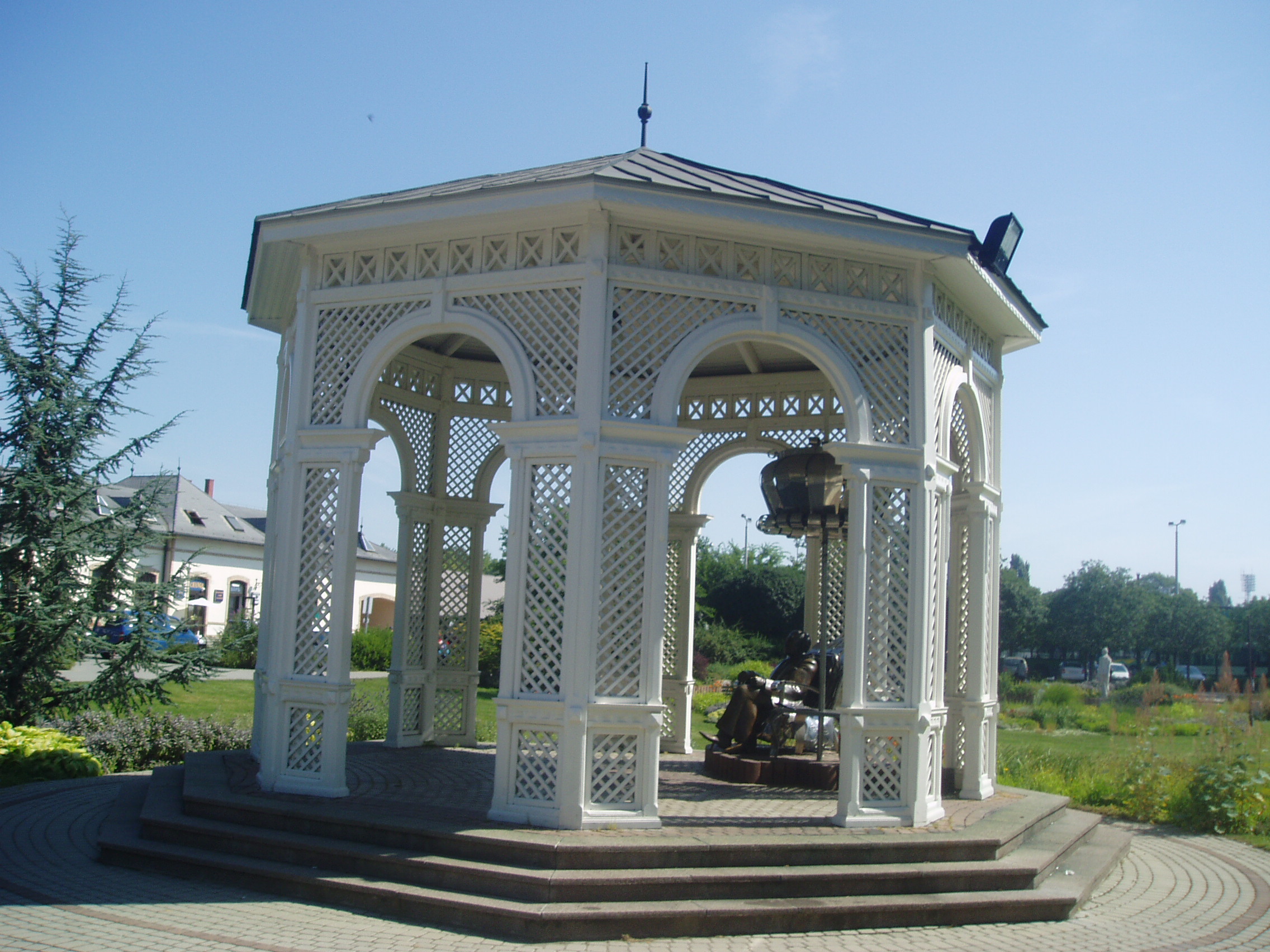 Nyilvános 1110 | 2466 | Siófok, Millennium park. Varga Imre: Kálmán Imre | Az 1920-ban épült, hajdani pompájában felújított állomásépület előtt 1994-ben készült el a 16 ezer négyzetméteres Millennium park. Gyönyörű pázsit, különleges cserjék, virágok, szobrok, tavacska, este díszkivilágítás ékesíti a területet. Itt állították fel - stílszerű környezetben, egy zenepavilonban - a város nagy szülötte (lásd: Siófok, Kálmán Imre sétány 5.), Kálmán Imre szobrát, mely karosszékben ülve, enteriőr–szerű környezetben ábrázolja a világhírű operettszerzőt. Az 1997-ben felavatott szobrot Varga Imre készítette, aki maga is siófoki születésű és számos alkotása tekinthető meg a városban (lásd: Siófok, Fő tér). Az ő alkotása a Művészeti iskola előtt álló Bartók–szobor is (lásd: Siófok, Mártirok útja 5.). A fénykép 2006 júliusában készült. http://www.siofok.hu/seta_a_varosban_hu.php |