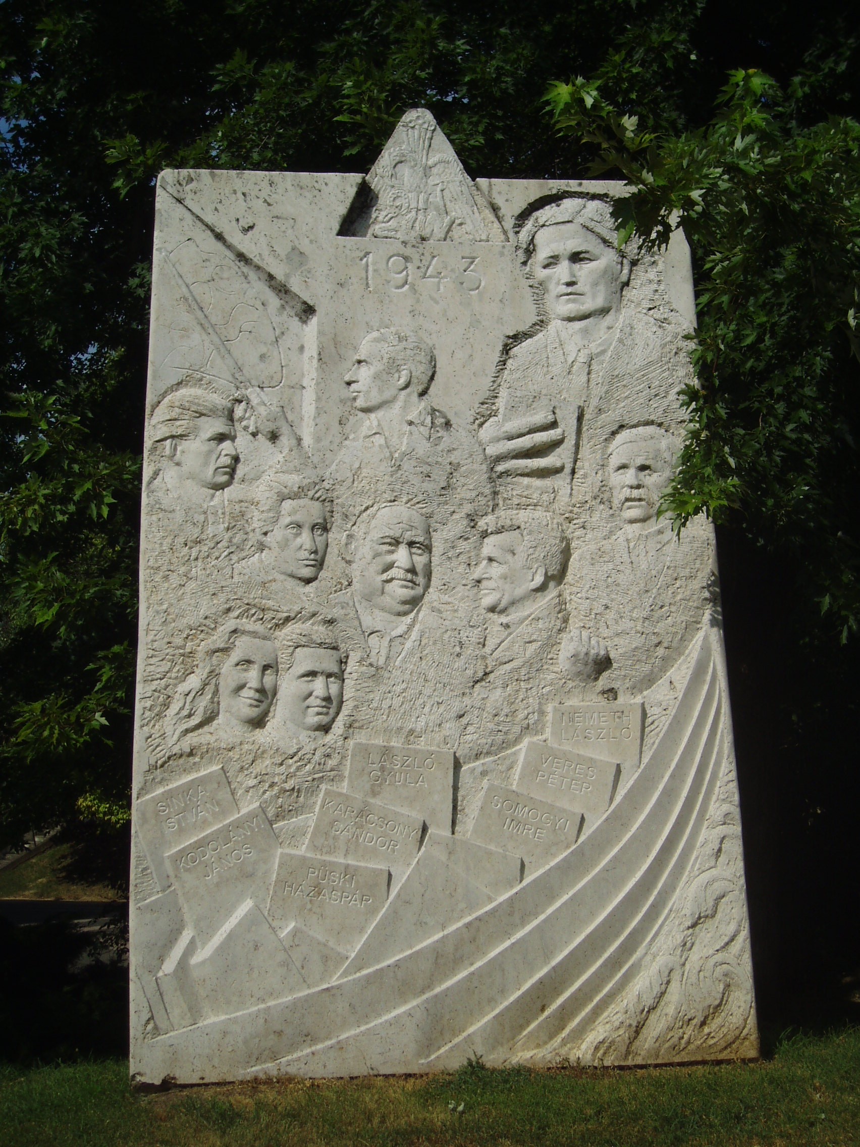 Nyilvános 1476 | 3715 | Balatonszárszó, Hősök tere: az 1943-as írótalálkozó emlékműve | 1943. augusztus 20-23. között Püski Sándor, a Magyar Élet Könyvkiadó tulajdonosa és a Soli Deo Gloria Szövetség közös rendezésében jött létre a legendás, azóta jelképpé vált szárszói konferencia. A rendezvényen, amelynek fő témája a magyarság háború utáni életének lehetősége volt, mintegy hatszázan vettek részt. Az emlékművet a Szárszó Baráti Kör és a Püski Kiadó kezdeményezésére állították 2000. augusztusában. Mint az avatóünnepség szónokai elmondották, a szárszói konferencia a független demokratikus Magyarország, az összefogás és a megújulás történelmi jelképe. Diénes Attila szobrászmuvész 10 tonnás kőoszlopban faragta meg az 1943-as szárszói konferencia legendás alakjait: Sinka Istvánt, Kodolányi Jánost, a Püski-házaspárt, Karácsony Sándort, László Gyulát, Somogyi Imrét és Németh Lászlót. A fénykép 2007 júniusában készült. Felh. irod.: Emlékmű a megújulás jelképének. = www.balatonpress.com |