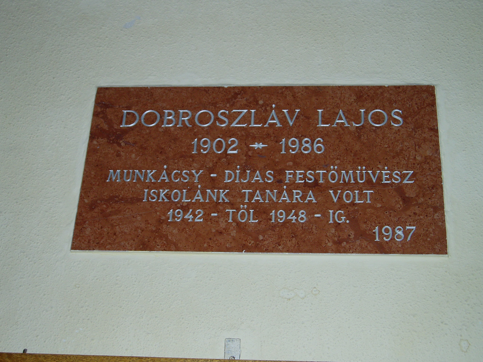 Nyilvános 1280 | 3668 | Tata, Tanoda tér 5. Eötvös József Gimnázium: Dobroszláv Lajosemléktáblája | A tatai gimnáziumot 1765-ben gróf Esterházy Miklós alapította, s vezetésére a piarista tanítórendet kérte fel. Az iskola kezdetben a közeli majki kamalduli szerzetesek többször is átalakított gazdasági épületeiben működött. A jelenlegi iskolaépületet a XX. század elején emelték, 1912-ben kezdődött meg benne a tanítás. Az első emeleti folyosó falán neves egykori tanárok és diákok emléktábláit helyezték el. Dobroszláv Lajos (1902-1986) Munkácsy-díjas festőművész 1942 és 1948 között a gimnázium tanára volt. 1948-ban, a piarista gimnázium államosításakor általános iskolába helyezték át, 1950-ben onnét is elbocsátották. Mivel ugyanebben az évben elnyerte a Munkácsy-díjat, megbízták a tatai állami múzeum megszervezésével. 1954-ig volt a múzeum igazgatója, nehéz politikai légkörben. Az 1939 óta kiállító művész, akit a magyar akvarellfestészet nagy mesterének ismernek el, haláláig Tatán élt. A fénykép 2005. júliusában készült. Felh. irod.: www.eotvos-tata.sulinet.hu Wehner Tibor: Tatai szobrok, emlékművek, emléktáblák. Tata, 1980 Kövesdi Mónika: Száz éve született Dobroszláv Lajos. = Új Forrás 2003. 3. |