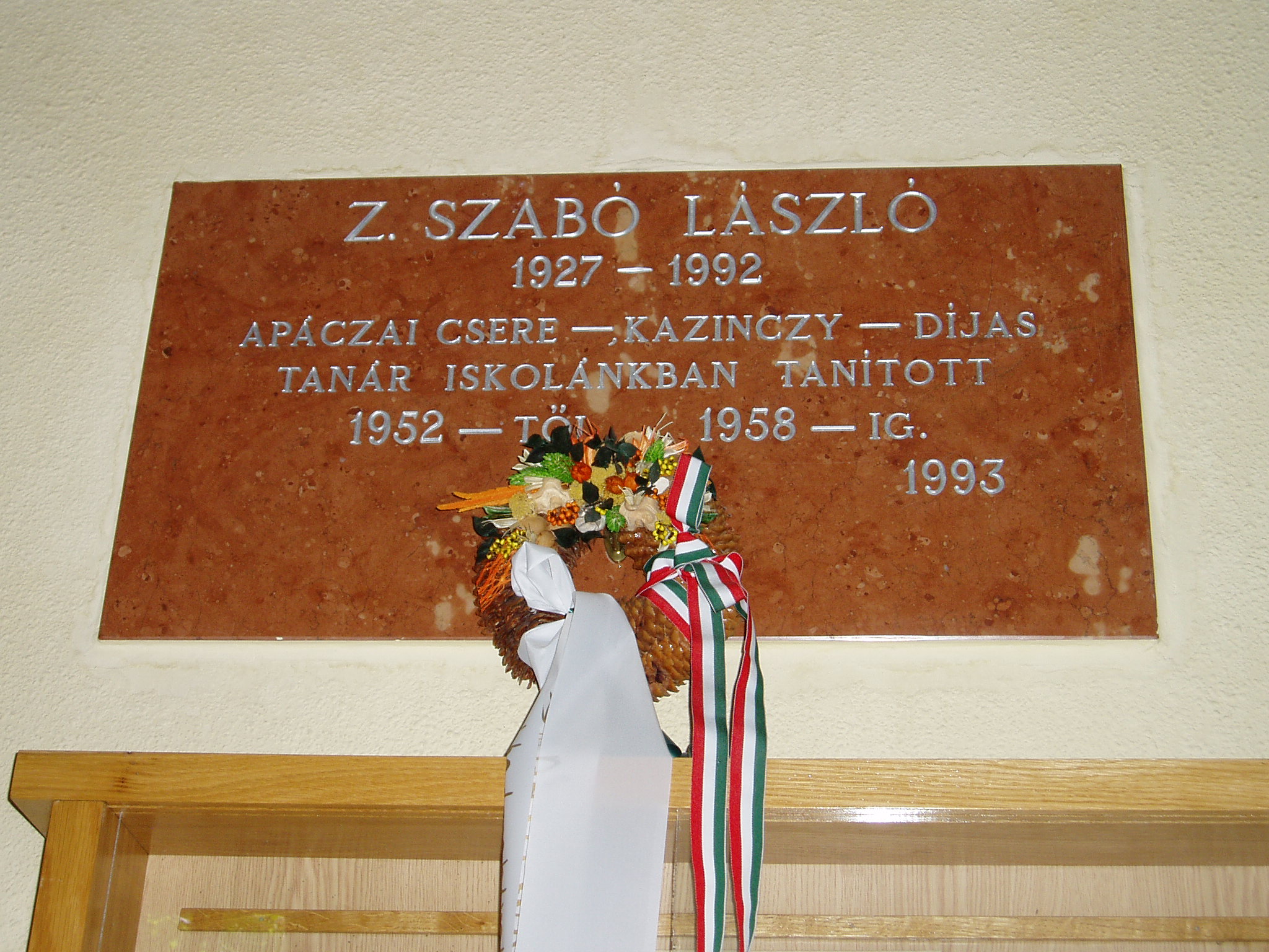 Nyilvános 1295 | 3063 | Tata, Tanoda tér 5. Eötvös József Gimnázium: Z. Szabó László emléktáblája | A tatai gimnáziumot 1765-ben gróf Esterházy Miklós alapította, s vezetésére a piarista tanítórendet kérte fel. Az iskola kezdetben a közeli majki kamalduli szerzetesek többször is átalakított gazdasági épületeiben működött. A jelenlegi iskolaépületet a XX. század elején emelték, 1912-ben kezdődött meg benne a tanítás. Az első emeleti folyosó falán neves egykori tanárok és diákok emléktábláit helyezték el. Z. Szabó László (1927-1992) irodalmár 1952 és 1958 között volt a gimnázium tanára. Későbbi élete Győrhöz kötötte. Az 1960-as, 1970-es években az országos hírnevű Győri Ifjúsági Irodalmi Színpad dramaturgjaként működött. A Kazinczy Anyanyelvi és Szépkiejtési Verseny egyik életre hívója, s a Radnóti Miklós Emlékbizottság első titkáraként a Költészeti Biennálé és a Radnóti Miklós Országos Felnőtt Amatőr Vers- és Prózamondó Verseny létrehozója volt. A fénykép 2005. júliusában készült. Felh. irod.: www.eotvos-tata.sulinet.hu Németh András: In memoriam Z. Szabó László. = www.versmondo.hu |