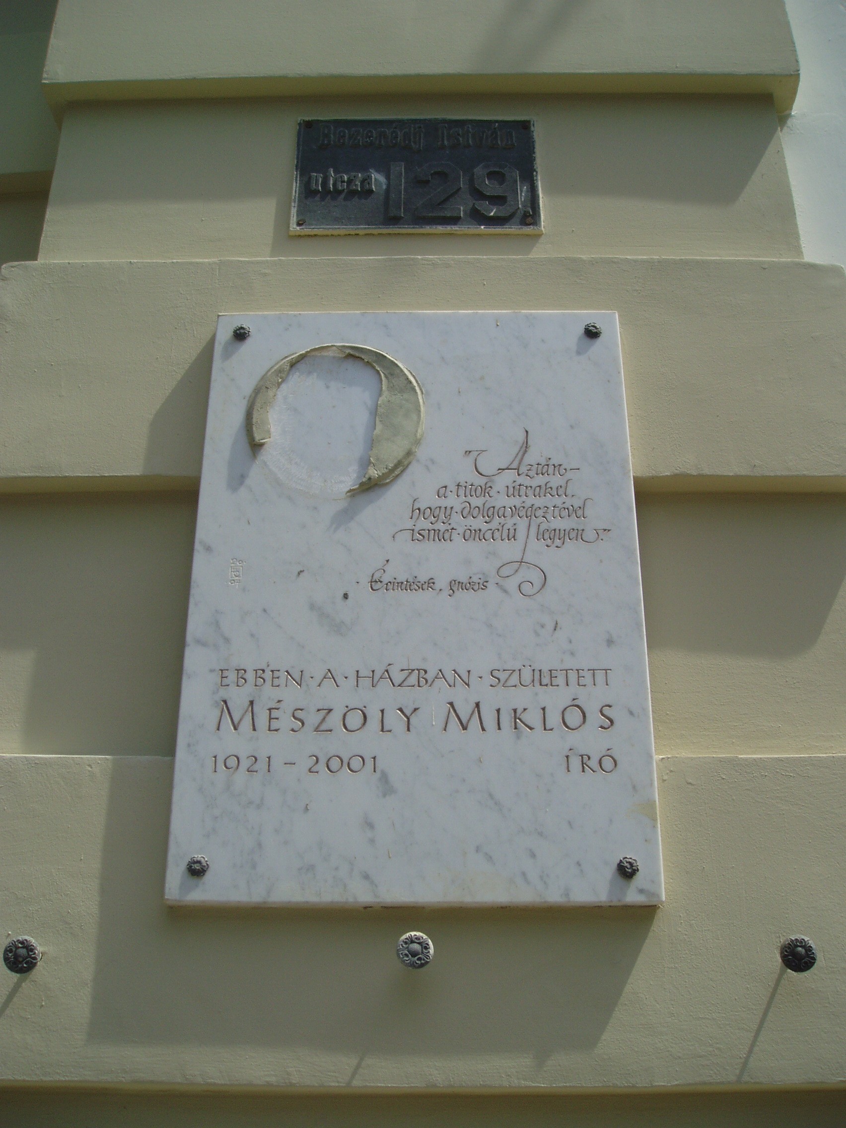 Nyilvános 1035 | 1708 | Szekszárd, Bezerédj utca 2. | Ebben a házban született 1921. január 19-én - Molnár Miklós néven - Mészöly Miklós író, költő (2001-ben hunyt el Budapesten). Emléktábláját 2004. január 19-én avatták fel özvegye, Polcz Alaine jelenlétében (az író portrédomborműve sajnos már hiányzott róla, amikor 2006. nyarán lefényképeztem - K. K.). 2005 januárjában Babits Mihály szülőházának szomszédságában, a Babits Mihály utca 15. számú házban megnyitották az "Irodalom Háza - Mészöly Miklós Múzeum" elnevezésű intézményt. A múzeumot a Polcz Alaine által Szekszárd városának ajándékozott hagyatékból rendezték be. A kiállítás valósághűen idézi fel Mészöly Miklós és Polcz Alaine budapesti lakásának két részletét. Az antik bútorokkal berendezett könyvtárszobában az író nagy biedermeier íróasztala áll, rajta évtizedekig használt írógépe. A zsúfolt könyvespolcok felett a barátok által ajándékozott festmények, művészeti reprodukciók láthatók. A puritán kis háló-dolgozószobában erdélyi csergével borított ágya. Mellette lóg a falon a szekszárdi borrend medálja, a Demokratikus Charta 1992. szeptember 4-i nagygyűlésének belépőkártyája és egy amerikai emlék. Egyszerű íróasztala felett megsárgult fotók, képek. A falakon körben könyvekkel megrakott polcok sorakoznak. A két szobában együtt több mint 2500 kötet látható az író tekintélyes könyvtárából. A fénykép 2006 júliusában készült. Felh. irod.: www.szekszard.hu |