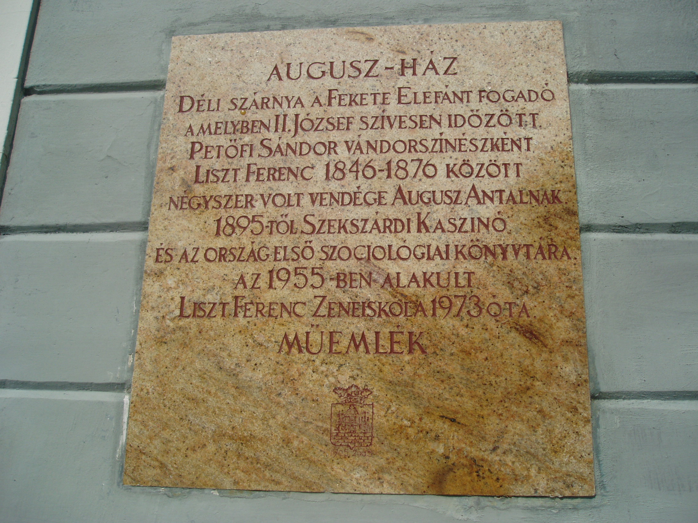 Nyilvános 1015 | 1650 | Szekszárd, Széchenyi utca 36-38. Augusz-ház | Az Augusz–család egykori kúriája, amelyben négy alkalommal vendégeskedett Liszt Ferenc, három eltérő korú épületrészből áll. Legrégebbi része a jelenleg kékesszürkére festett déli szárny. Id. Augusz Antal 1820 körül építtette, az ő fia volt Liszt barátja, a később bárói címet kapott Augusz Antal. Az épület három homokkő oszlopon nyugvó középső része az 1830-as évekből való. A trieszti Miramare–kastély által ihletett rózsaszínű, tornyos északi szárnnyal pedig az 1860-as években bővíttette otthonát az ekkor már bárói címmel felruházott Augusz Antal. Ezt az épületrészt a szekszárdi Stann Jakab tervezte. Ennek a szárnynak első emeletén voltak Liszt Ferenc kertre néző lakosztályának szobái. A helyi hagyomány szerint az idősebb Augusz idejében ebben házban szolgált az az egykori katona, akiről Garay János Háry János alakját mintázta. Liszt Ferenc négy alkalommal töltött rövidebb–hosszabb időt Szekszárdon ebben a házban Augusz Antal vendégeként (1846, 1865, 1870, 1876). Később az épületben működött a szekszárdi kaszinó, s ennek keretében az ország első közgazdasági és társadalomtudományi szakkönyvtára. 1973 óta a Liszt Ferenc Zeneiskola otthona. Az épület középső szárnyának városközpont felé eső homlokzatán 1931-ben leplezték le Liszt Ferenc portrédomborművel díszített emléktábláját, Wigand Edit alkotását. A verset Bodnár István, a kaszinó igazgatója írta. A fénykép 2006 júliusában készült. Felh. irod.: www.szeki.hu/turista/kalauz/magyar/tu000012.htm www.csatolna.hu/hu/tolnamegye Vendel–Mohay Lajosné: Liszt–emlékek Szekszárdon. Szekszárd, 1986 |