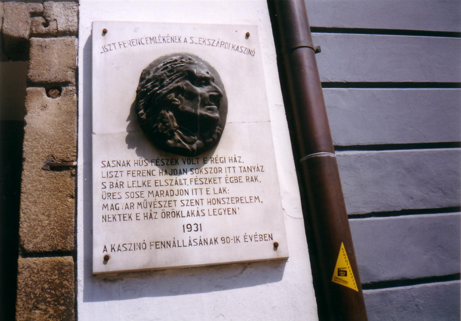 Nyilvános 984 | 1657 | Szekszárd, Széchenyi utca 36-38. Augusz-ház | Az Augusz–család egykori kúriája, amelyben négy alkalommal vendégeskedett Liszt Ferenc, három eltérő korú épületrészből áll. Legrégebbi része a jelenleg kékesszürkére festett déli szárny. Id. Augusz Antal 1820 körül építtette, az ő fia volt Liszt barátja, a később bárói címet kapott Augusz Antal. Az épület három homokkő oszlopon nyugvó középső része az 1830-as évekből való. A trieszti Miramare–kastély által ihletett rózsaszínű, tornyos északi szárnnyal pedig az 1860-as években bővíttette otthonát az ekkor már bárói címmel felruházott Augusz Antal. Ezt az épületrészt a szekszárdi Stann Jakab tervezte. Ennek a szárnynak első emeletén voltak Liszt Ferenc kertre néző lakosztályának szobái. A helyi hagyomány szerint az idősebb Augusz idejében ebben házban szolgált az az egykori katona, akiről Garay Háry János alakját mintázta. Liszt Ferenc négy alkalommal töltött rövidebb–hosszabb időt Szekszárdon ebben a házban Augusz Antal vendégeként (1846, 1865, 1870, 1876). Később az épületben működött a szekszárdi kaszinó, s ennek keretében az ország első közgazdasági és társadalomtudományi szakkönyvtára. 1973 óta a Liszt Ferenc Zeneiskola otthona. Az épület középső szárnyának városközpont felé eső homlokzatán 1931-ben leplezték le Liszt Ferenc portrédomborművel díszített emléktábláját, Wigand Edit alkotását. A verset Bodnár István, a kaszinó igazgatója írta. A fénykép 2006 júliusában készült. Felh. irod.: www.szeki.hu/turista/kalauz/magyar/tu000012.htm www.csatolna.hu/hu/tolnamegye Vendel–Mohay Lajosné: Liszt–emlékek Szekszárdon. Szekszárd, 1986 |