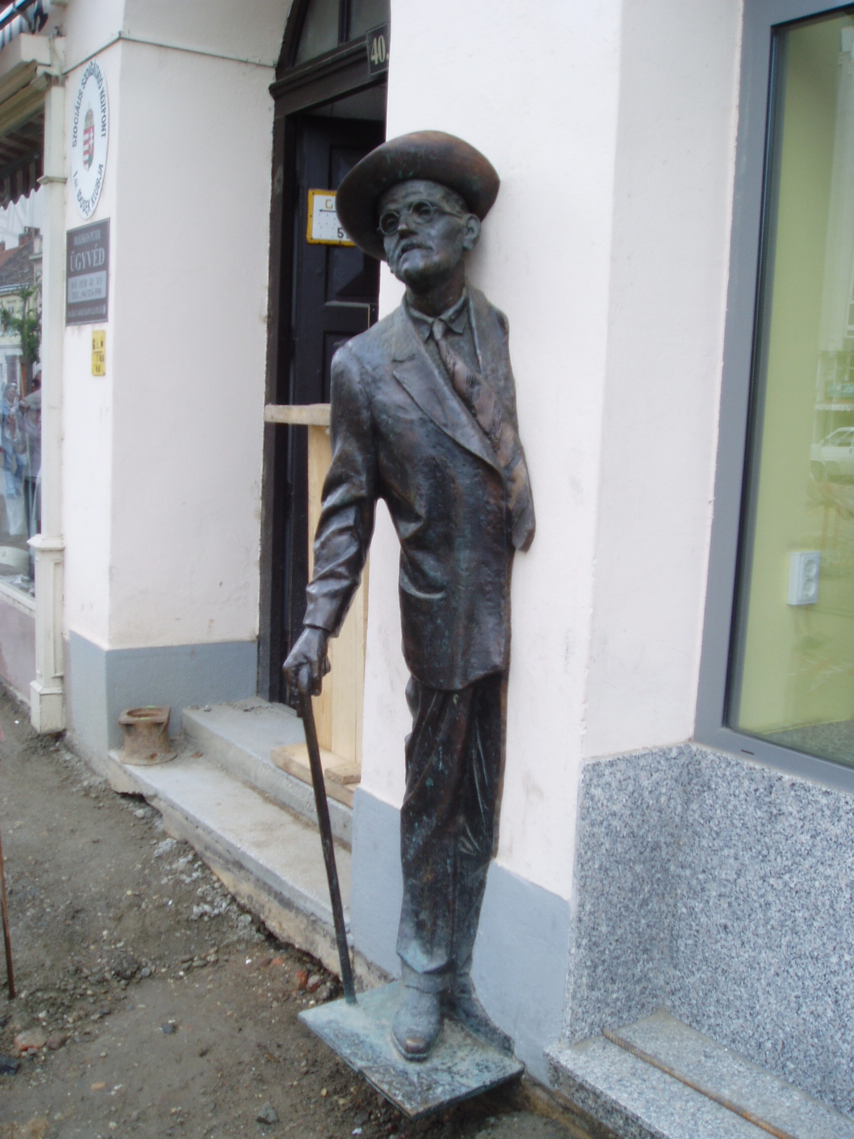 Nyilvános 988 | 1661 | Szombathely, Fő tér 40. | 2004-ben ezen a helyen állították fel James Joyce író életnagyságú szobrát, Veres Gábor alkotását, amint a ház falából kilépve üdvözli az arra járót. Magyar és angol nyelvű felirat hívja fel a figyelmet, hogy Joyce híres regényének, az Ullyssesnek a hőse, Leopold Bloom (Virág Lipót) szombathelyi származásúnak mondja magát. A helytörténeti kutatások szerint az 1800-as évek közepén valóban élt Blum család Szombathelyen, akik annakidején ebben a házban laktak. Joyce talán trieszti tartózkodása idején kerülhetett valamelyikükkel kapcsolatba. A modern irodalom alapművének számító Ulysses, a kisember odüsszeiája június 16-án, egy nap alatt játszódik Dublinban. Az 1950-es évek óta a Joyce rajongók világszerte kortárs művészeti fesztiválokkal ünneplik ezt a napot (Bloomsday), amelynek már Szombathelyen is hagyománya van: az első magyar James Joyce Társaság is Szombathelyen alakult meg 2001-ben. A téma iránt érdeklődőnek érdemes elolvasni Najmányi László: A Blum ház rejtélye c. regényét (Golyós Toll Kft. – DIREKT kiadó, 2007). A fénykép 2006 májusában készült. Felh. irod.: www.bloomsday.hu A Bloomsday Szombathelyen. = www.litera.hu www.joyce.hu |