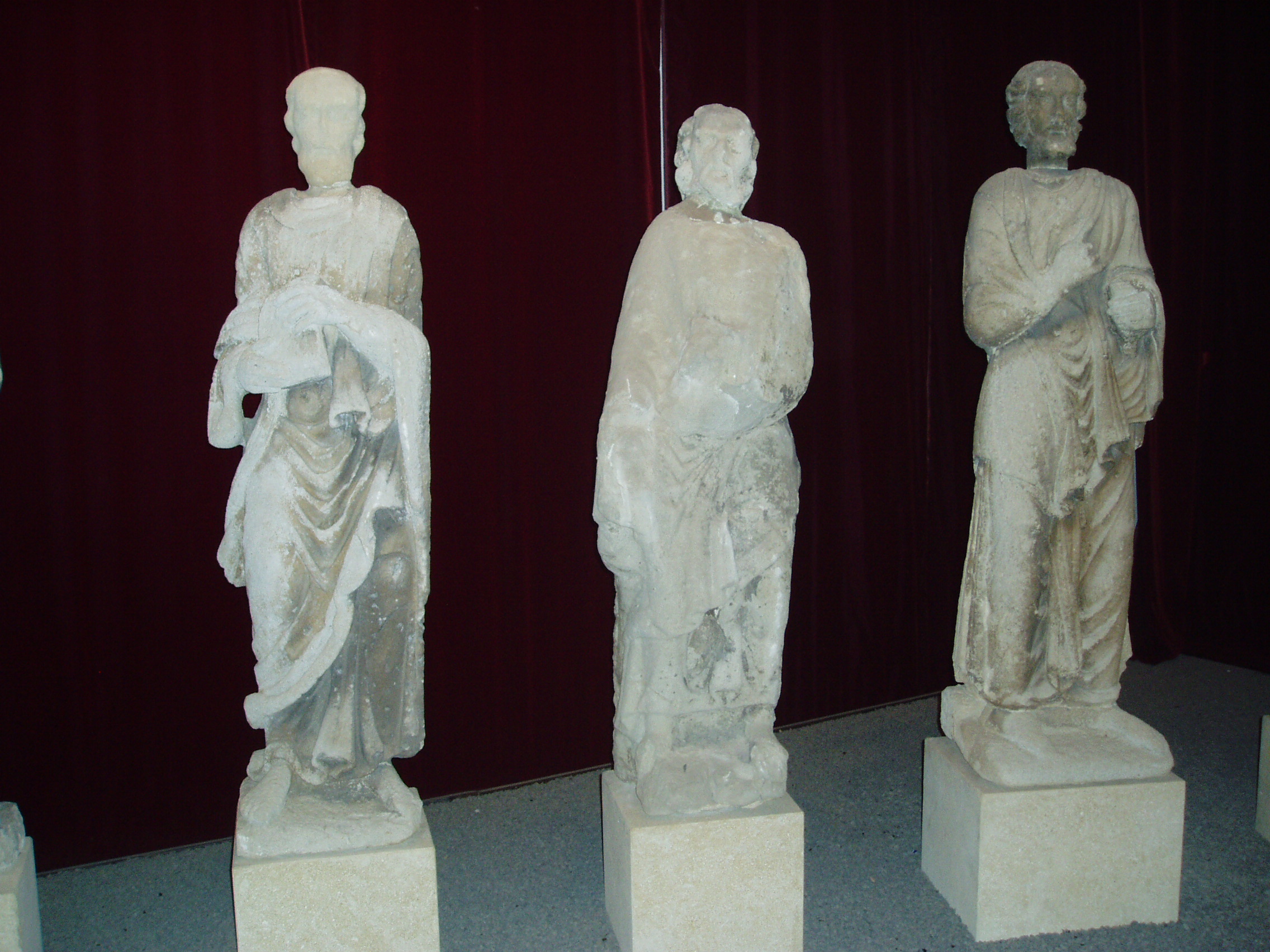 Nyilvános 1015 | 1706 | Szombathely, Kisfaludy utca 9. Savaria Múzeum | Az érdeklődő a Savaria Múzeum nagytermében tekintheti meg a jáki templom (lásd: Ják, Templom) eredeti homlokzati szobrait, amelyek Krisztust és a tizenkét apostolt ábrázolják. Az életnagyságú szobrok a magyarországi későromán szobrászat kiemelkedő alkotásai. Eredetileg a templom kapuépítményének homlokzatát díszítették, lépcsőzetesen elhelyezve, oszlopokkal elválasztott, karéjos záródású fülkékben állva. Jákon jelenleg pontos másolataik láthatók. Kicserélésük oka a nagyértékű szobroknak az időjárás viszontagságaitól való megvédése volt. A jáki apátsági templom, az egykori jáki bencés apátság monumentális bazilikája a magyarországi román stílusú építészet kiemelkedő, szinte szimbolikus alkotása. A hazai középkori nemzetségi monostorok egyedülálló épségben fennmaradt képviselője, mely művészi gazdagságával, a táj képébe illeszkedő mesteri elhelyezésével hívja fel magára a figyelmet. A fénykép 2006 májusában készült. |