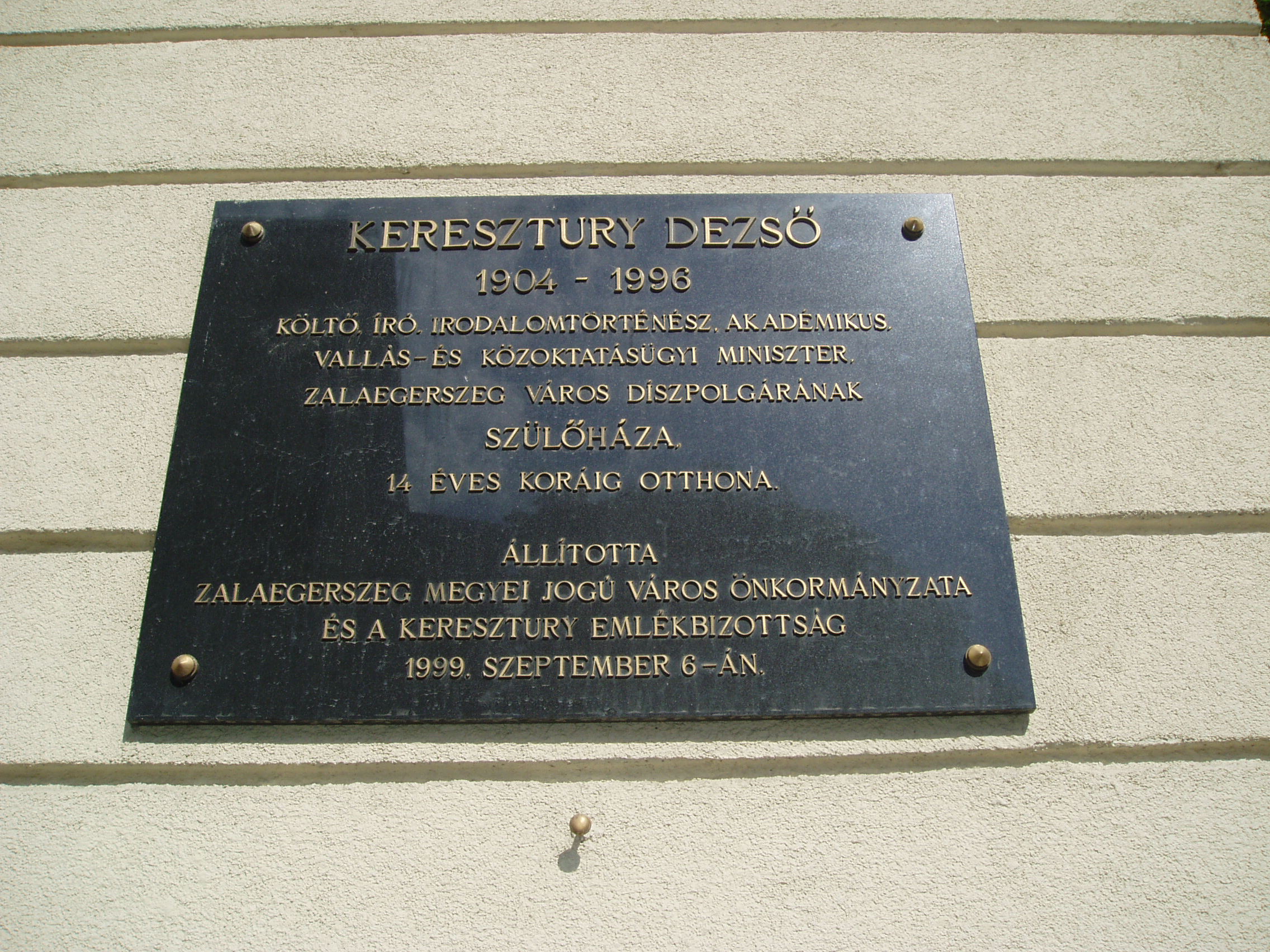 Nyilvános 1123 | 2505 | Zalaegerszeg, Mártírok útja 2. | Ebben a városközponti épületben született 1904. szeptember 6-án Keresztury Dezső (1904-1996) író, irodalomtörténész, kritikus, műfordító, miniszter, akadémikus. Édesapja ügyvéd volt, 1915-18 között a város polgármestere. Elemi iskolai tanulmányait és a gimnázium első négy osztályát szülővárosában végezte. Berlini évek után 1936-43-ban az Eötvös Kollégium tanára, közben 1937-43-ban a Pester Lloyd rovatvezetője volt. 1945-47-ben vallás- és közoktatásügyi miniszter, 1945-48-ban az Eötvös Kollégium igazgatója, 1948 után az MTA főkönyvtárnoka, 1950-71 között az Országos Széchenyi Könyvtár főosztályvezetője, 1985-től a Magyar Irodalomtörténeti Társaság elnöke, majd tiszteletbeli elnöke. 1973-tól az MTA levelező, 1982-től rendes tagja. A kortárs magyar irodalom sokoldalú művelője, a magyar irodalom- és művelődéstörténet elismert kutatójaként számos magyar és nemzetközi társaság tagja, kitüntetettje volt. 1968 után került újra szoros kapcsolatba szülővárosával, amelynek 1975-ben díszpolgára lett. 1993-ban megjelent "Emlékezéseim. Szülőföldjeim" című önéletrajzi kötete itt töltött gyermekkorának emlékeit is felidézi. Egykori iskoláját több alapítvánnyal is támogatta; édesapja szőlőhegyi hajlékát a városnak adományozta, ahol fokozatosan könyvtára is helyet kap, s alkotóházként működik. Szülőházán 1999-ben helyeztek el emléktáblát. A felvétel 2006 júniusában készült. Felh. irod.: Zalai életrajzi lexikon. = http://zalai.dfmk.hu/zalaiak |