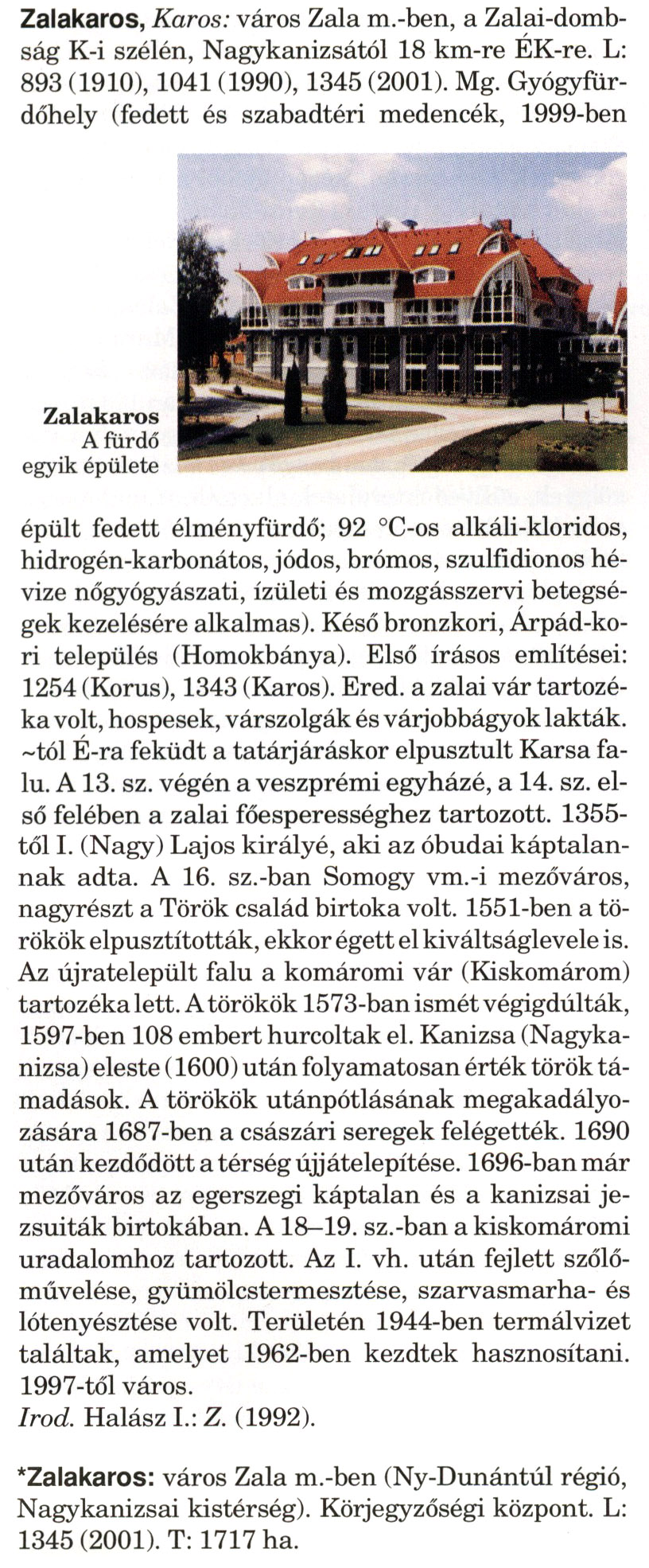 Nyilvános 1509 | 3018 | A szócikkek felismertetett szövege: | (A csillag után a kiegészítő kötetből származó szöveg következik) Zalakaros, Karos: város Zala m.-ben, a Zalai-dombság K-i szélén, Nagykanizsától 18 km-re ÉK-re. L: 893 (1910), 1041 (1990), 1345 (2001). Mg. Gyógyfür-dőhely (fedett és szabadtéri medencék, 1999-ben épült fedett élményfürdő; 92 °C-os alkáli-kloridos, hidrogén-karbonátos, jódos, brómos, szulfidionos hévize nőgyógyászati, ízületi és mozgásszervi betegségek kezelésére alkalmas). Késő bronzkori, Árpád-kori település (Homokbánya). Első írásos említései: 1254 (Korus), 1343 (Karos). Ered. a zalai vár tartozéka volt, hospesek, várszolgák és várjobbágyok lakták. ~tól É-ra feküdt a tatárjáráskor elpusztult Karsa falu. A 13. sz. végén a veszprémi egyházé, a 14. sz. első felében a zalai főesperességhez tartozott. 1355-től I. (Nagy) Lajos királyé, aki az óbudai káptalannak adta. A 16. sz.-ban Somogy vm.-i mezőváros, nagyrészt a Török család birtoka volt. 1551-ben a törökök elpusztították, ekkor égett el kiváltságlevele is. Az újratelepült falu a komáromi vár (Kiskomárom) tartozéka lett. A törökök 1573-ban ismét végigdúlták, 1597-ben 108 embert hurcoltak el. Kanizsa (Nagykanizsa) eleste (1600) után folyamatosan érték török támadások. A törökök utánpótlásának megakadályozására 1687-ben a császári seregek felégették. 1690 után kezdődött a térség újjátelepítése. 1696-ban már mezőváros az egerszegi káptalan és a kanizsai jezsuiták birtokában. A 18—19. sz.-ban a kiskomáromi uradalomhoz tartozott. Az I. vh. után fejlett szőlőművelése, gyümölcstermesztése, szarvasmarha- és lótenyésztése volt. Területén 1944-ben termálvizet találtak, amelyet 1962-ben kezdtek hasznosítani. 1997-től város. Irod. Halász I.: Z. (1992). *Zalakaros: város Zala m.-ben (Ny-Dunántúl régió, Nagykanizsai kistérség). Körjegyzőségi központ. L: 1345 (2001). T: 1717 ha. A szócikkek a következő lexikonból származnak: Cím: Magyar nagylexikon Közreműködő: Élesztős László (1949) (szerk.) ; Barabás Éva (1943) (szerk.) ; Berényi Gábor (1946) (szerk.) ; Bárány Lászlóné (szerk.) ; Adelmann-né Kertész Judit (1945) (közrem.) ; Froemel Károlyné Jáky Éva (1936) (közrem.) ; Akadémiai Kiadó és Nyomda Vállala Szerz. közl.: [... Élesztős László főszerk.] ; [szerk. Barabás Éva et al.] ; [bibliogr. Adelmanné Kertész Judit] ; [kész. az Akadémiai Kiadó Magyar Nagylexikon Szerkesztőségében] Kiadás: Budapest : Akad. K., 1993- Kötetei: 1. köt., A - Anc 2. köt., And - Bag 3. köt., Bah - Bij 4. köt., Bik - Bz 5. köt., C - Csem 6. köt., Csen - Ec 7. köt., Ed - Fe 8. köt., Ff - Gyep 9. köt., Gyer - Iq 10. köt., Ir - Kip 11. köt., Kir - Lem 12. köt., Len - Mep 13. köt., Mer - Nyk 14. köt., Nyl - Pom 15. köt., Pon - Sek 16. köt., Sel - Szö 17. köt., Szp - Ung 18. köt., Unh - Z 19. köt., Kiegészítő kötet, A - Z ETO jelzet: 030=945.11 Szakjelzet: 030 Cutter: M 14 ISBN: 963-05-6611-7 [!ISBN 963-05-6615-X] Nyelv: magyar Megjegyzés: Az 5. kötettől kiad. a Magyar Nagylexikon Kiadó ; A 6. kötettől főszerk. Berényi Gábor ; A 6. kötettől szakszerk. Bárány Lászlóné et al. ; A 6. kötettől bibliogr. Froemel Károlyné ; Bibliogr. a szócikkek végén |